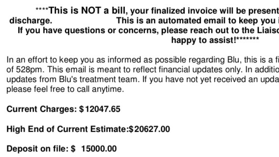 After we surpassed the initial $5,000 deposit, I asked "are we doing everything we can?" The technician said "No, but we aren't equipped for alternative treatment if he isn't responding to traditional therapies."