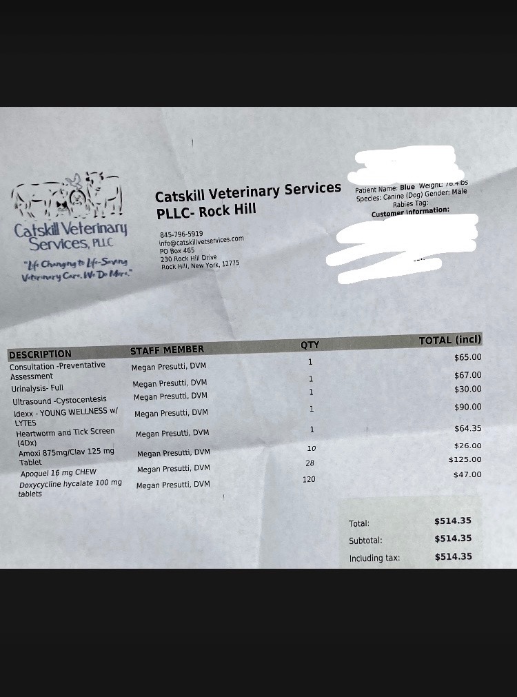 After spending just one night with him, it became clear that something was wrong. Blue was urinating frequently, with visible blood; his paws were irritated; and he was limping, clearly in pain. At his vet visit, we found out he has a urinary tract infection, severe allergies in his paws, and Lyme disease—something he will live with for the rest of his life. The Lyme disease will need ongoing treatment to prevent damage to his kidneys. We would also like to get X-rays on his back leg to determine the cause of his pain. In addition, Blue needs to be neutered and receive his rabies shot.