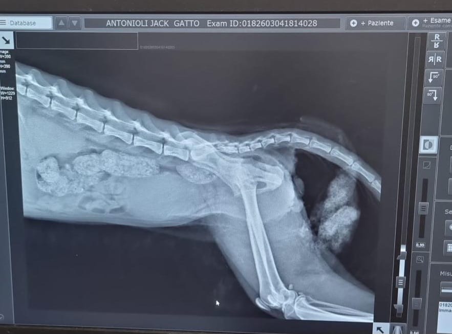 Jack è un gattino FeLV positivo che pochi giorni fa ha perso all’improvviso l’uso del treno posteriore. La radiografia mostra un’ombra sull’ultima vertebra: potrebbe essere un tumore o un coagulo causato da una caduta. L’unico modo per capirlo è una risonanza magnetica urgente.