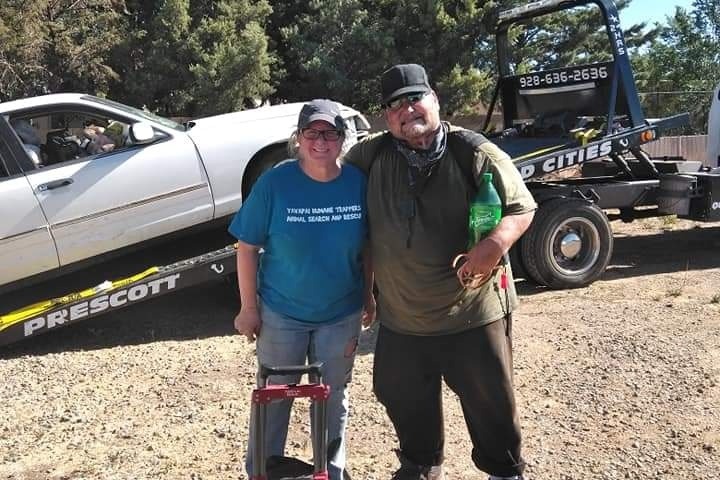 Denny and his dog Bo have been living out of their broken down car for months. He stays in empty lots until he is asked to leave- since his car does not run, he has been using flat bed tow trucks to move his car to other locations.  Denny is in poor health- has a tracheotomy and severe wounds on his feet which require twice weekly dressing changes by a local clinic. Last  Tuesday when I went to bring him water and food, he told me that he needed to be moved again by the end of the day. I along with a local animal rescue group - Yavapai Humane Trappers Animal Search and Rescue (501c3) coordinated getting him a hotel room for 1 week (Tues-Tues) and got his car towed to a local mechanic who said that it was beyond repair.  Through donations from local community members we were able to raise some money, but it's not enough to purchase a older van or small motorhome for him to live in & drive  and if we extend his motel stay that eats into his auto fund we have raised. Denny is a very kind man, and boy does he love his dog Bo. I need your assistance in helping raise funds so that we can get him safe and reliable transportation/place to live.