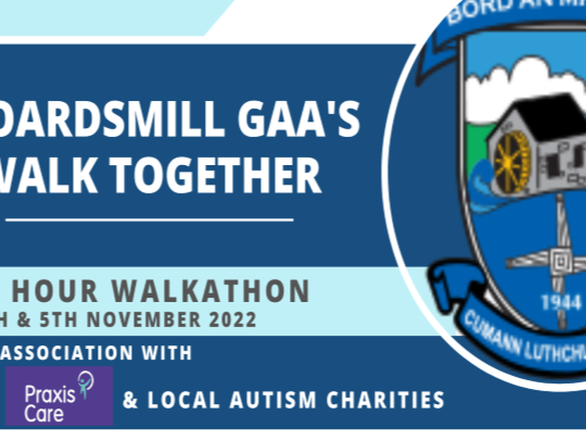24-hour Walkathon in association with Praxis Care and Local Autism Charities to raise much-needed funds to develop new toilet facilities and dressing rooms at our back pitch (Patsy's Field). The Boardsmill GAA, LGFA and Camogie Clubs have combined forces to complete a 24-hour walk at our pitch in one-hour slots starting Friday, 4th November at 5 pm, finishing Saturday, 5th at 5 pm.