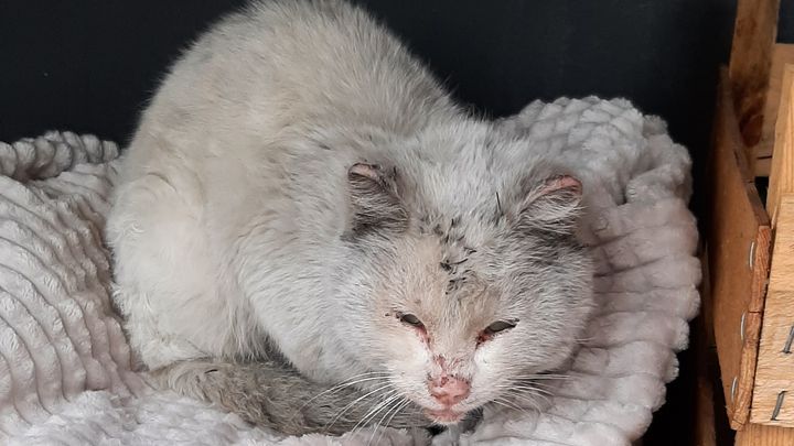 He has FELV (Feline leucemia), lung problems, infection in one of his paws cause of a broken claw, running nose, fleas, ticks and worms. His fur is in very bad shape and when we met him 1 week ago he was a barely alive.