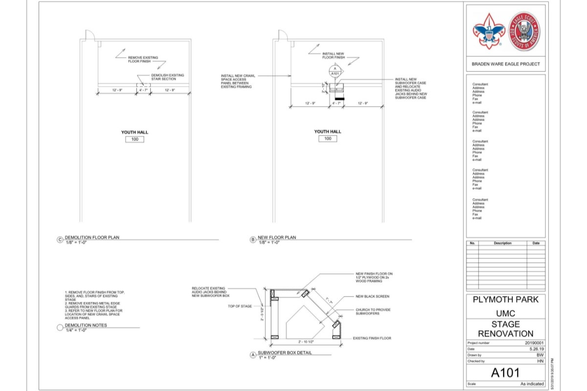 Please help me fund my eagle scout project in which I plan to improve the youth hall stage at Plymouth Park United Methodist Church. I will be resurfacing the existing youth hall stage, rewiring the audio on the stage, building a speaker case to implement existing subwoofers, and resurfacing the existing drum set riser. Being able to complete this project would give me the opportunity to support a local community, and build a leadership skill set that I will be able to use for years to come. Thank you, Braden Ware