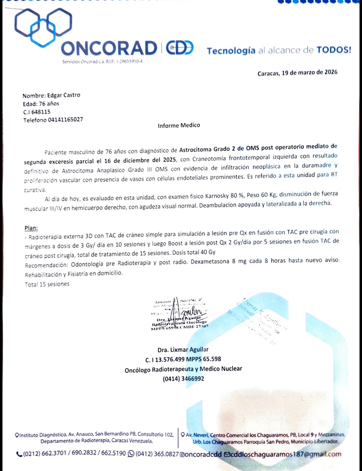 Hoy acudimos a ustedes con el corazón en la mano para pedir ayuda para Edgar Castro, un hombre de 76 años que está enfrentando una dura batalla contra un tumor cerebral (Astrocitoma). Edgar fue diagnosticado con este tumor, que ha evolucionado a una forma más agresiva. Ya fue sometido a una cirugía compleja, pero ahora su vida depende de un tratamiento urgente de radioterapia que no puede esperar.