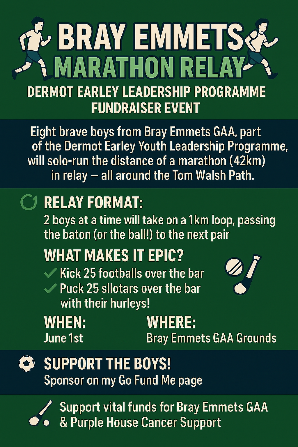 On June 1st June , 2025, myself and 7 of my team mates Conor Heffernan ,Sean Traynor,Sean Craig, Joshua Delaney ,Paul Farrell , Ben Donnelly and Tadgh O’Brien will run a relay marathon relay soloing a ball on the Tom Walsh path in Bray Emmets GAA and between each 2k will kick 25 footballs over the bar and puck 25 Sliothar over the bar
