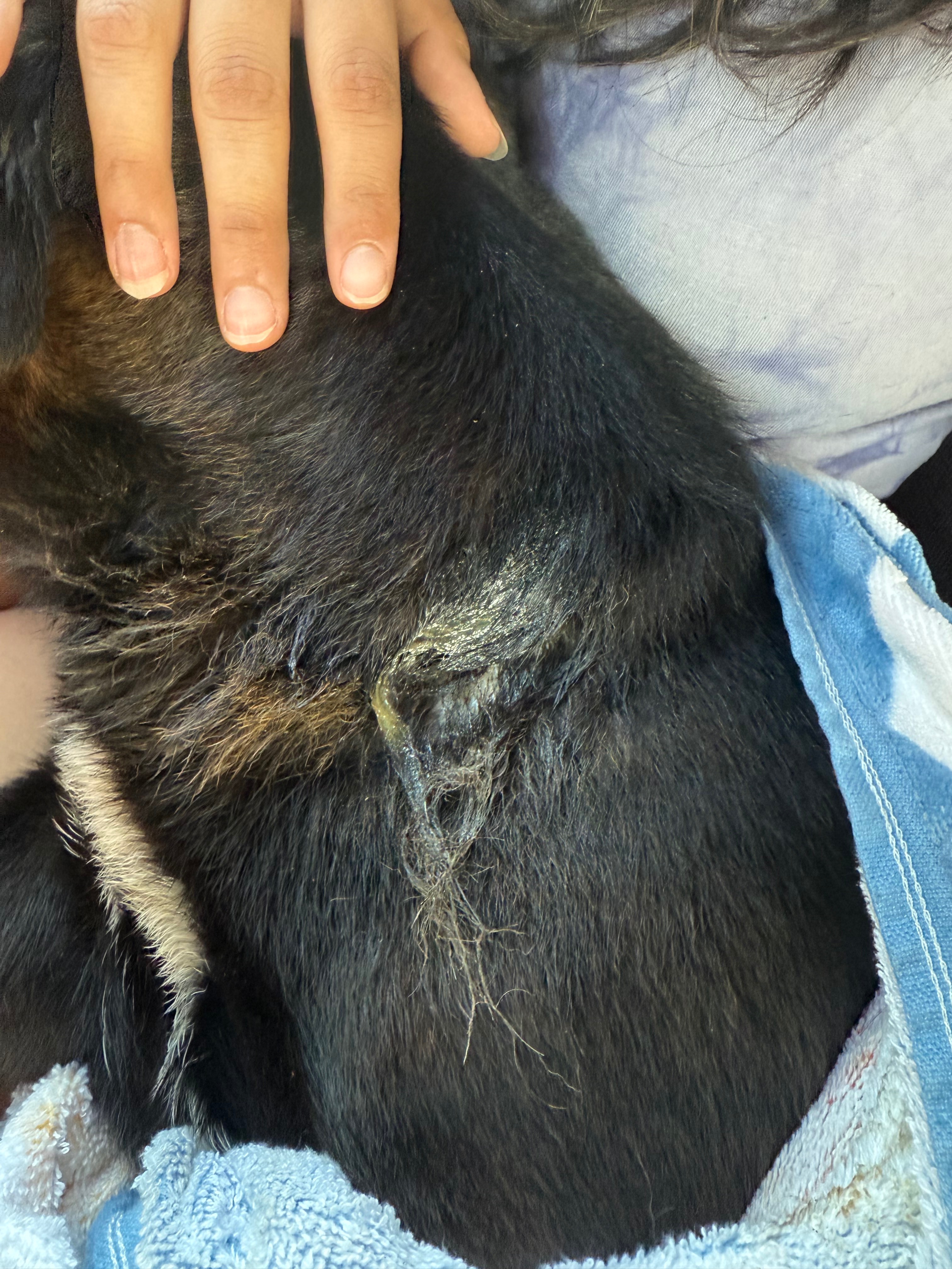 After carefully removing several layers of duck tape and the rope strangling her neck, we decided to keep her overnight since the shelters were closed. The next morning we took her to a local shelter where she’s currently getting the care she needs.