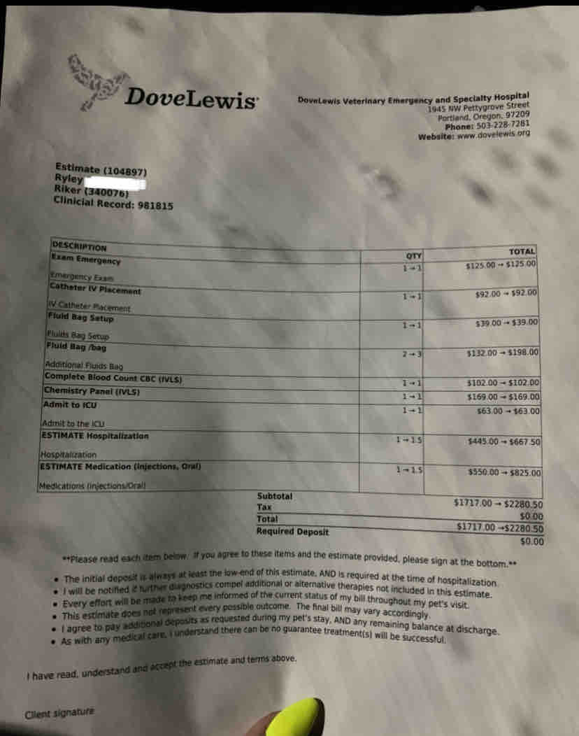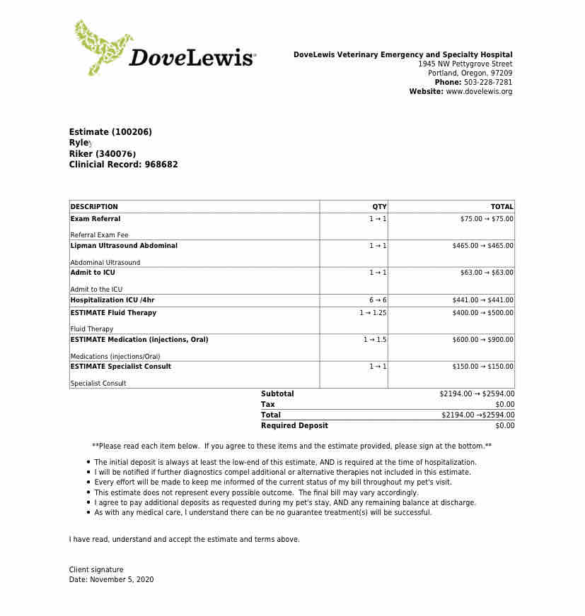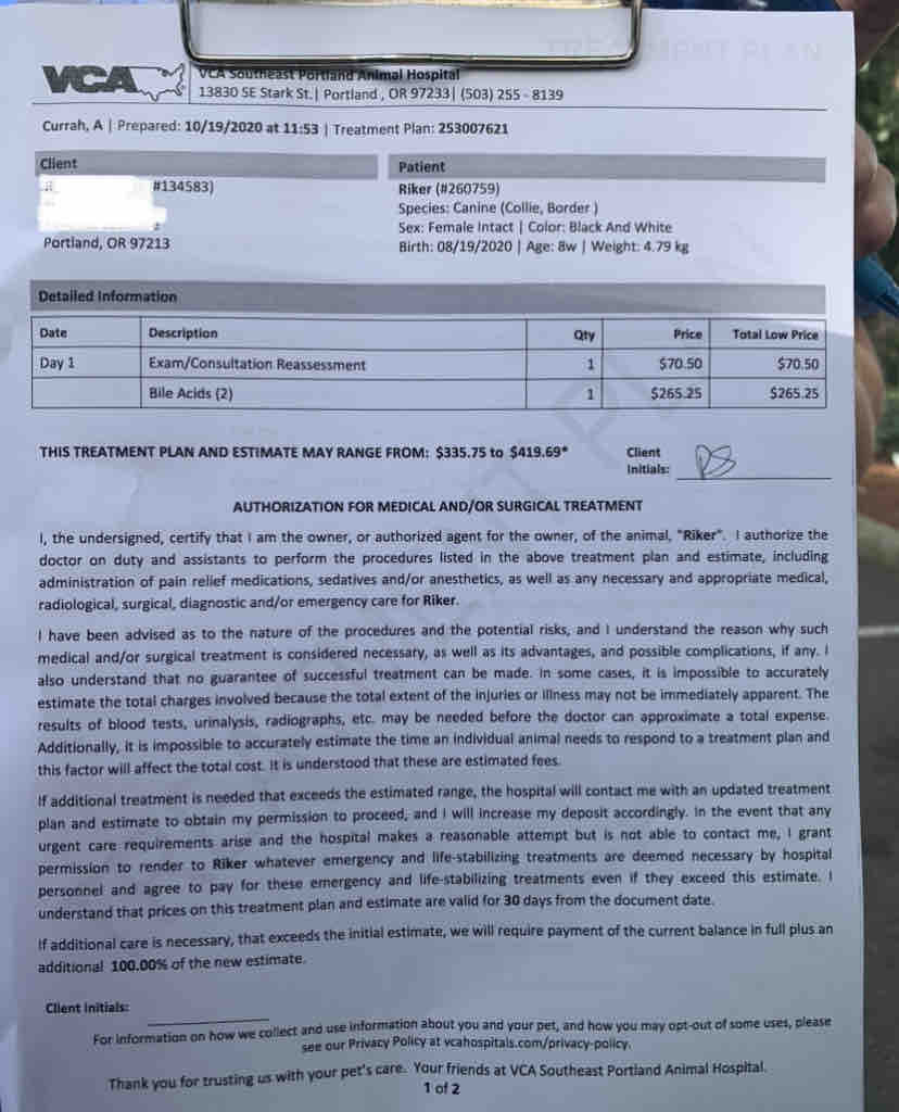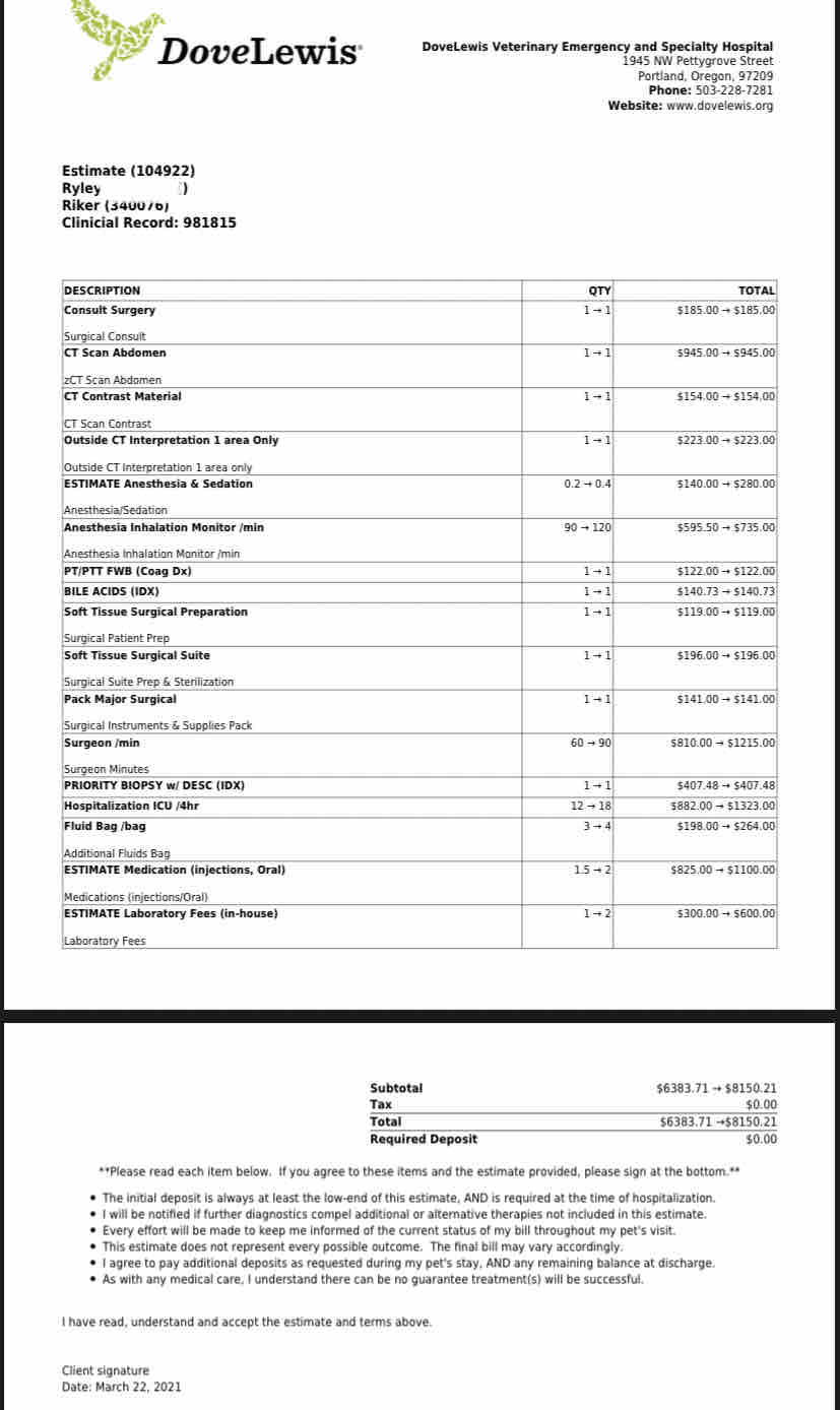 The high-end estimate of his surgery is $8,100. I’m hoping it will be less than this, but it does include a CT scan to identify what vessels need rerouting, the surgery itself, and two to three days of post-operation hospitalization. DoveLewis has done so many favors for me over the months of cutting down my costs and just generally taking such wonderful care of my sweet boy. Emergency care is expensive, but I’m so beyond thankful for this incredible crew of doctors and technicians who truly love my dog.