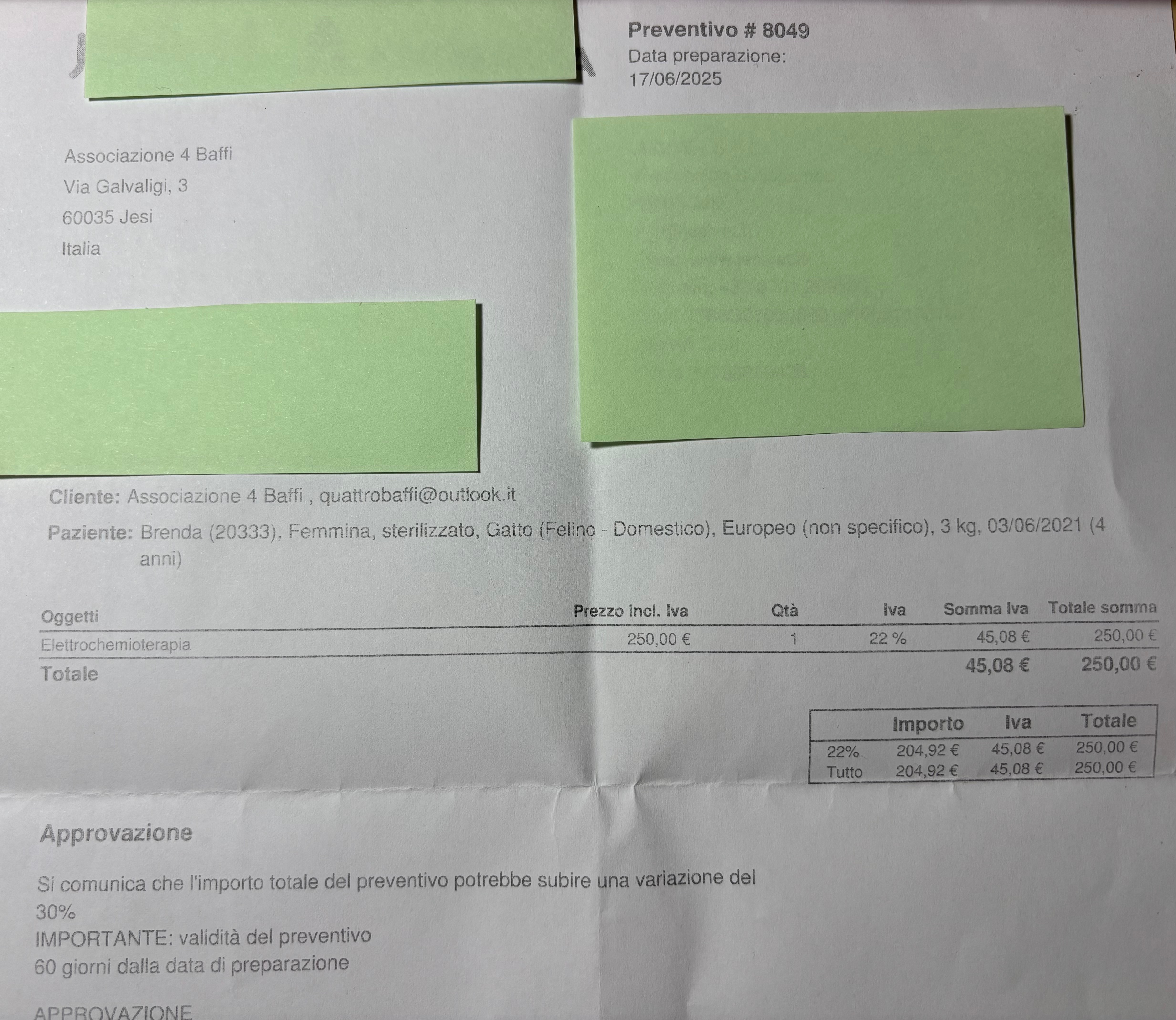 primo preventivo è di 250€ ed è relativo alla prima seduta, ma abbiamo già appuntamento per la seconda elettrochemio il 18 luglio. Come sempre, pubblicheremo i preventivi e le fatture nelle storie e nella raccolta fondi di gofundme ❤️