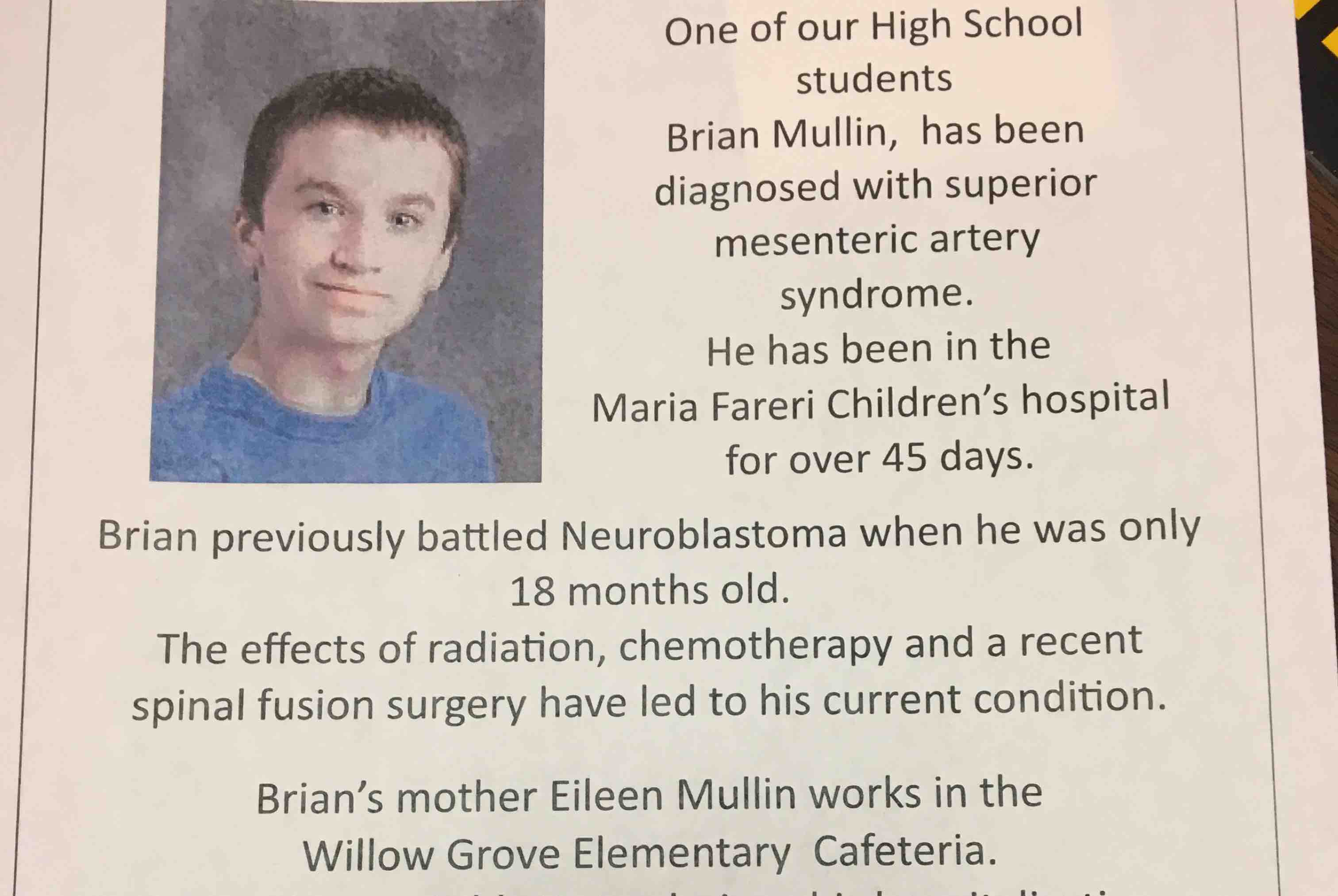 A North Rockland High School student, Brian Mullin, has been diagnosed with superior mesenteric artery syndrome. He has been in Maria Fareri Children’s hospital for 45 days. Brian previously battled Neuroblastoma when he was only 18 months old. The effects of radiation, chemotherapy and a recent spinal fusion surgery have led to his current condition. He and his family are facing uncovered medical bills and medical expenses. I want to raise money for him and his family to help them in their time of need. Brian is a good kid and an even better friend. Please let’s do this for him.