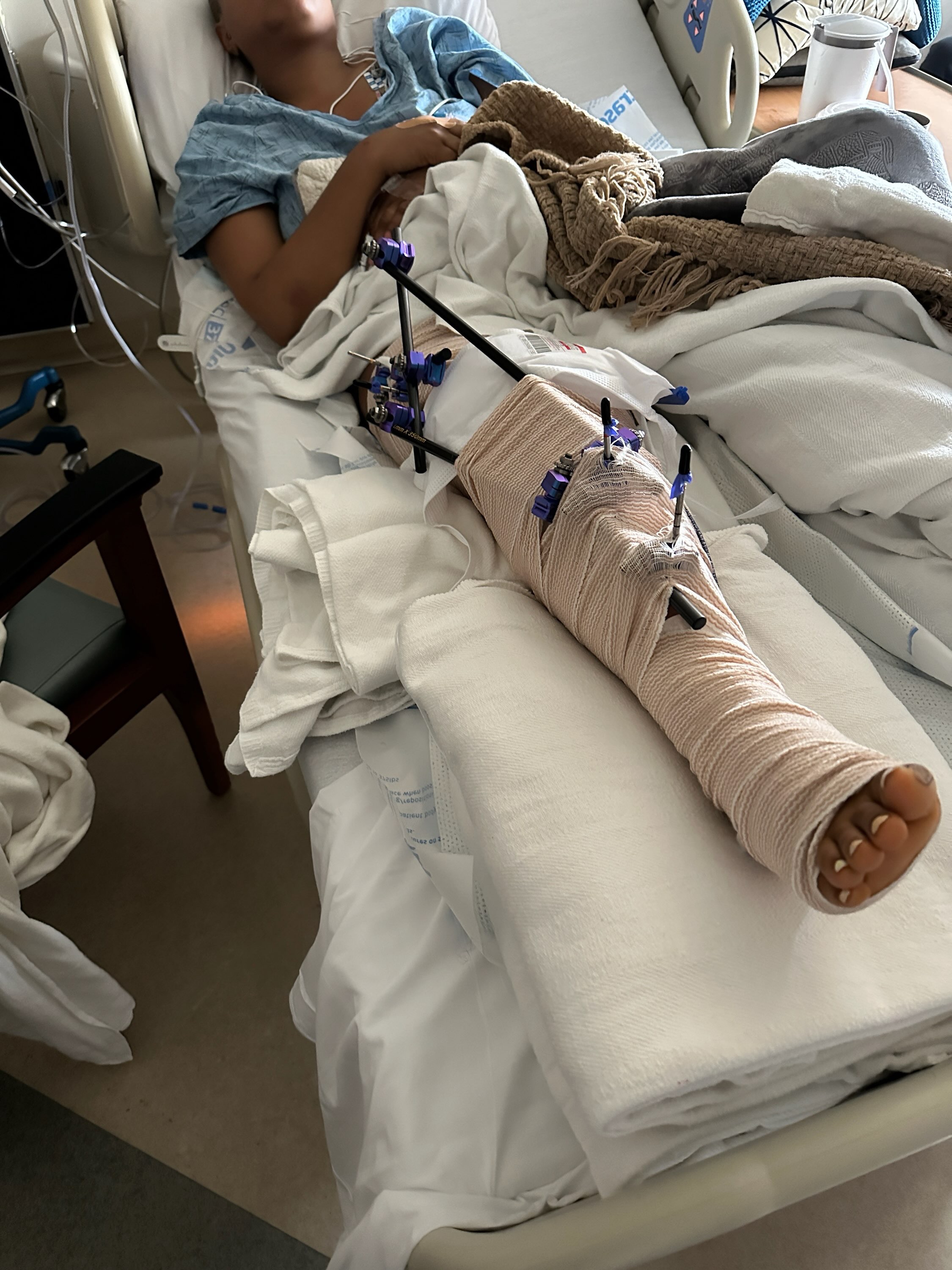The result: a leg broken in three places, a torn meniscus, and a body full of bruises and scrapes. I made it to the hospital thinking it was a quick fix — I didn’t even tell anyone. I truly believed I’d be in and out.