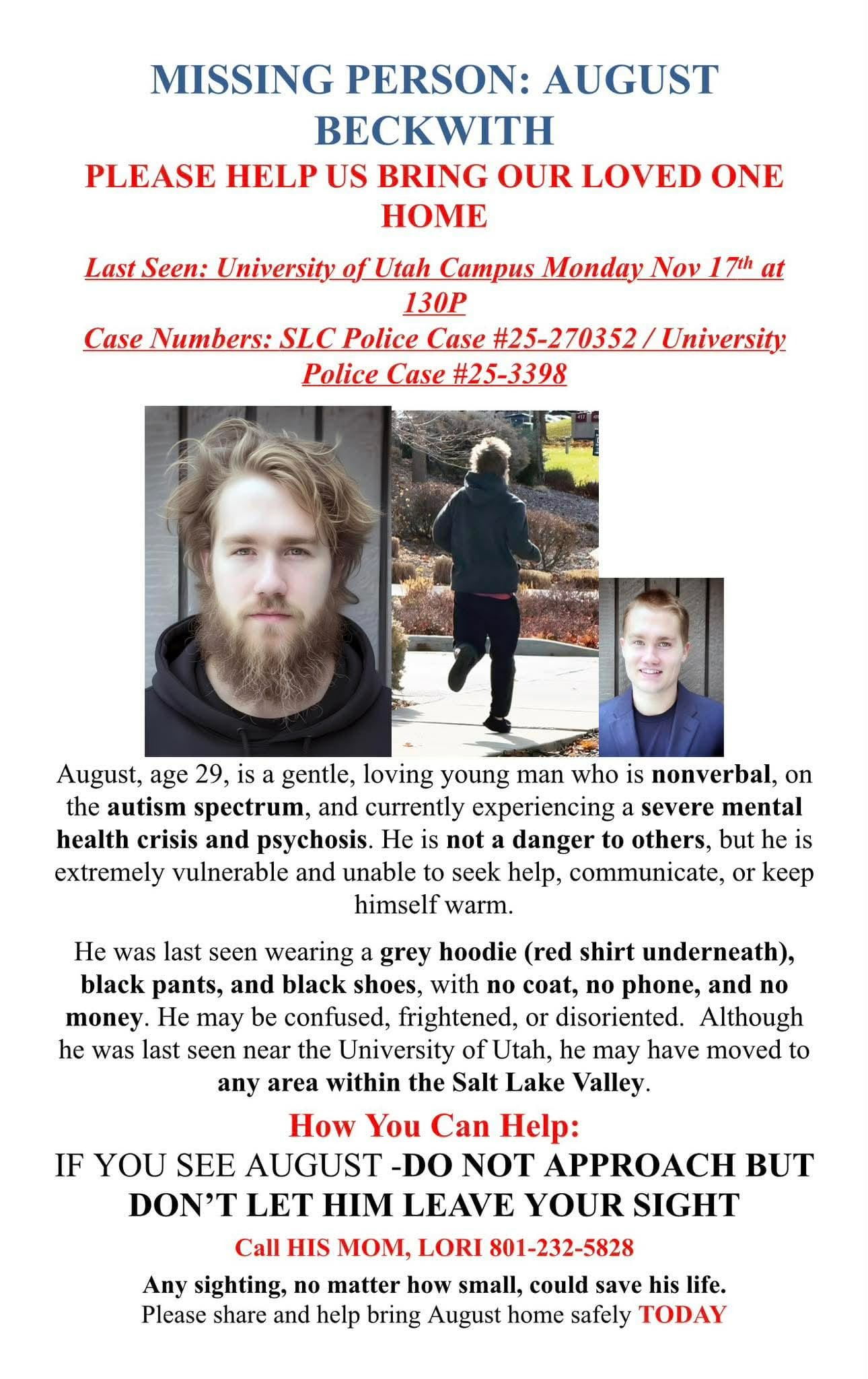 My name is Lori Beckwith and my autistic non-verbal son August Beckwith is missing and extremely vulnerable. We have currently been searching for him for 5 days after he was released from Huntsman mental health institute while he was still in psychosis. August was released into my care and I knew right away he still needed help and protection as he was not thinking clearly. When I took out my phone to ask for help he became frightened and ran away from me. I have not been able to locate him since but I am doing everything within my power to bring him home safe.