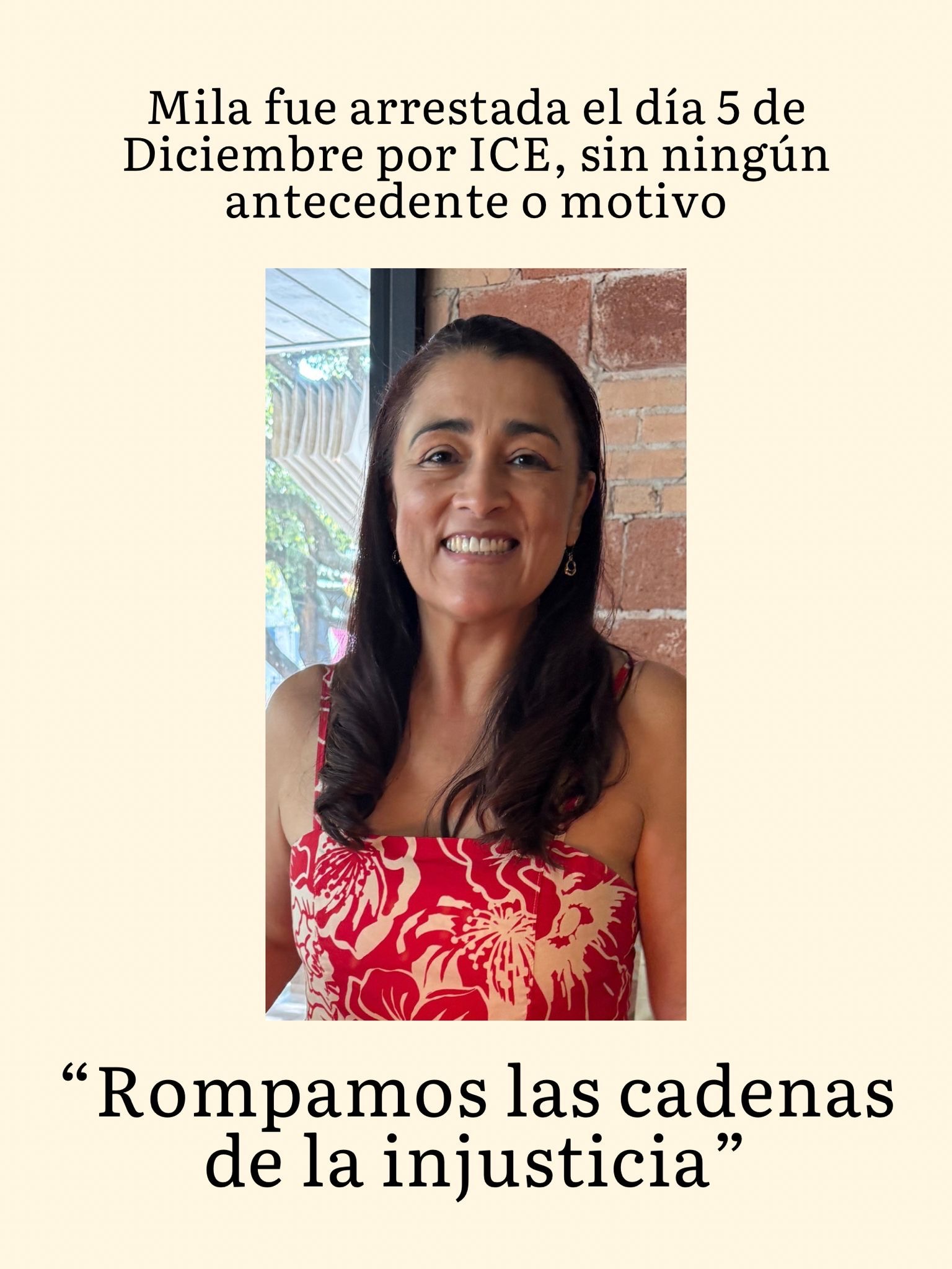 Mila Osorio es una madre muy querida y un verdadero pilar de nuestra comunidad, reconocida por su bondad, compasión y dedicación a ayudar a los demás. El 5 de diciembre fue detenida inesperadamente por ICE, sin tener antecedentes y sin representar ningún tipo de amenaza. Su detención es una injusticia dolorosa que ha destrozado a nuestra familia y a todos quienes la conocen.