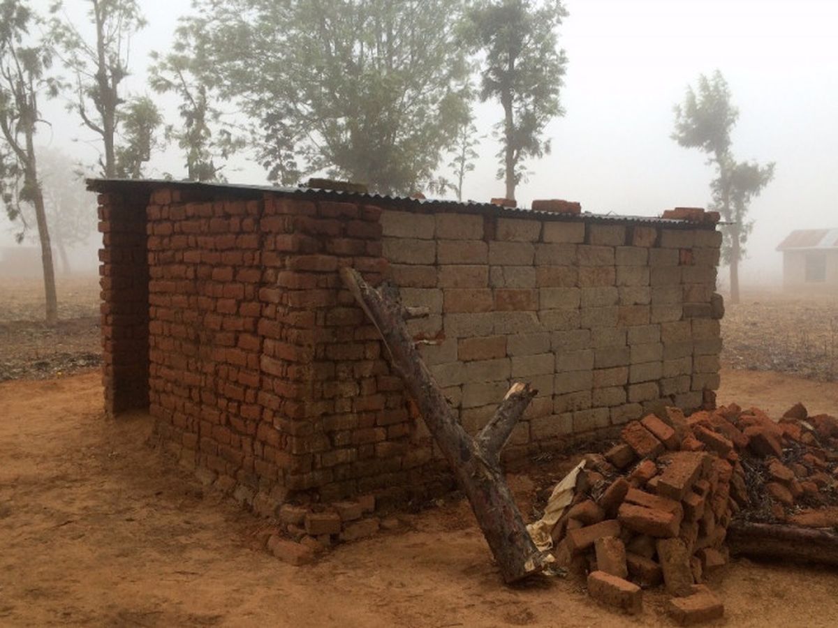 (Nutrition lesson with mamas at health clinic)The current latrine at the health clinic, with two stalls, is falling apart. Earlier this year a tree that fell during a storm ruined one wall of the latrine, which has temporarily been filled in with stacked cinder blocks. The latrine has no sink or handwashing station, and has dirt floors and no proper doors.