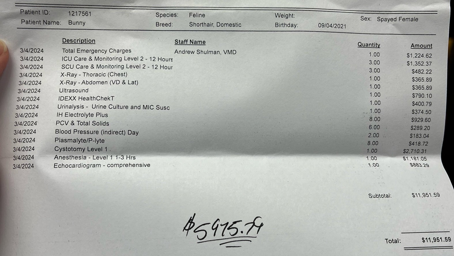 My baby Bunny had routine surgery for bladder stones on 2/28. A few days later I rushed her to the animal hospital for a rare complication. A portion of her bladder wall opened up and urine was spilling into her abdomen. She had surgery to repair it on 3/5 and has been stable in the hospital since. She is my world and I can't imagine losing her. Her life is priceless to me, I however have to find a way to pay for her hospitalization. I already have a second job with little shift availability through July but will continue doing my best to work more if a shift opens up. I thankfully have pet insurance that has been tremendously helpful, but my annual maximum reimbursement is $3k which I met with her first surgery so they will no longer reimburse me for further costs. All donations will go straight to paying her medical bill which I will attach to this GoFundMe and update with the final bill. Bunny and I are appreciative of any help no matter the amount! ❤️