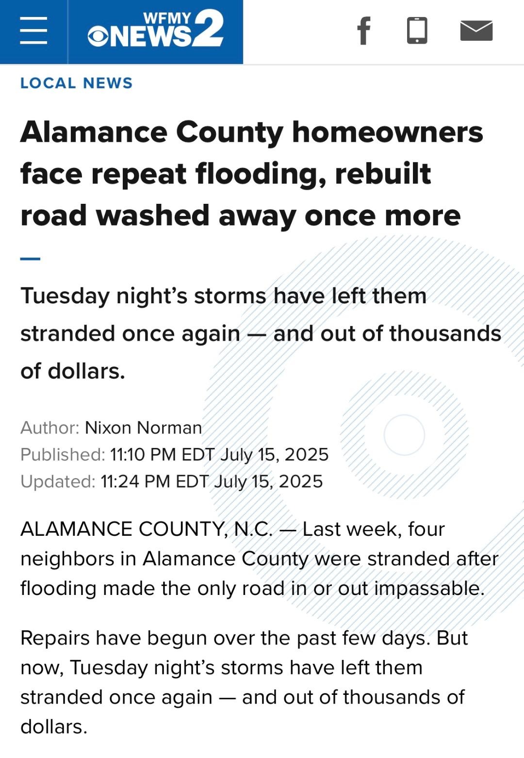 On Sunday, July 6th, 2025, when Tropical Storm Chantel moved through our area, it dumped 11 inches of rain. Among those affected were 4 families living on Jordan Meadows Drive in Burlington. The only way in and out of their homes was cut off when a bridge on their driveway washed away during the storm. They began the rebuilding process, only to have their efforts, along with $15,000.00 in materials, washed away by more flooding days later. Please join with us in helping these families start the rebuilding process, yet again. They will have to go another route, as far as a new bridge is concerned, which will be thousands and thousands more than they were anticipating. As of now, the fire department, EMS, and emergency responders cannot access the four family homes in case of an emergency. These families are in need of prayers and your support. Any amount will help! God Bless!