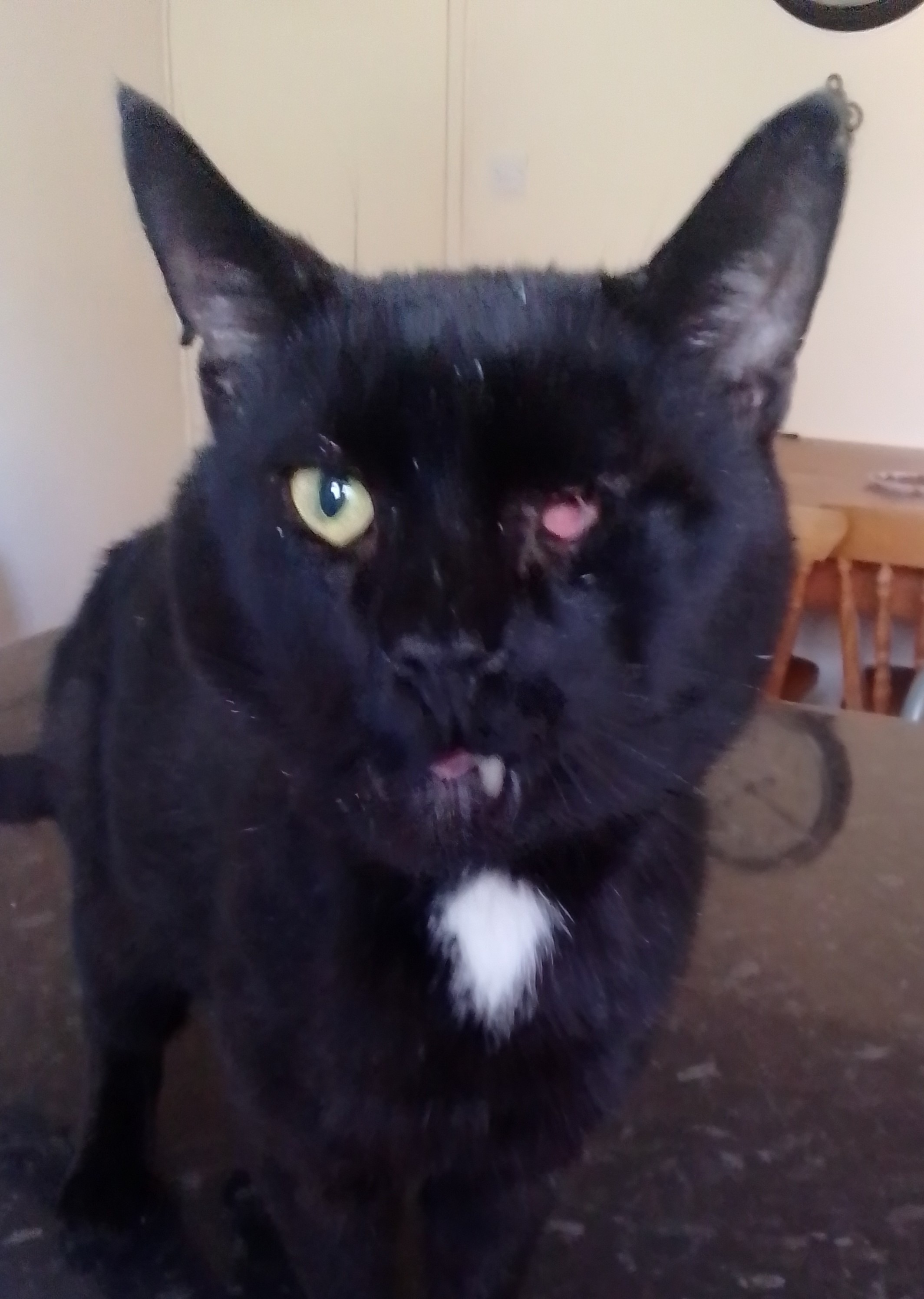 I'm assuming he's got himself in a fight and lost his left eye.