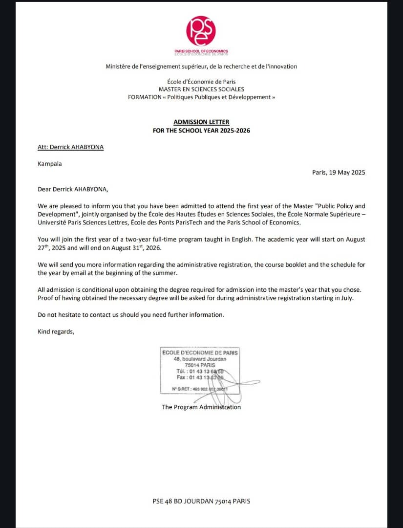 My name is Derrick Ahabyona and I am deeply honored to have been accepted into the Master’s in Public Policy and Development program at the prestigious Paris School of Economics. This opportunity is a dream come true — but without your kind support, I may not be able to afford the cost of living in Paris.