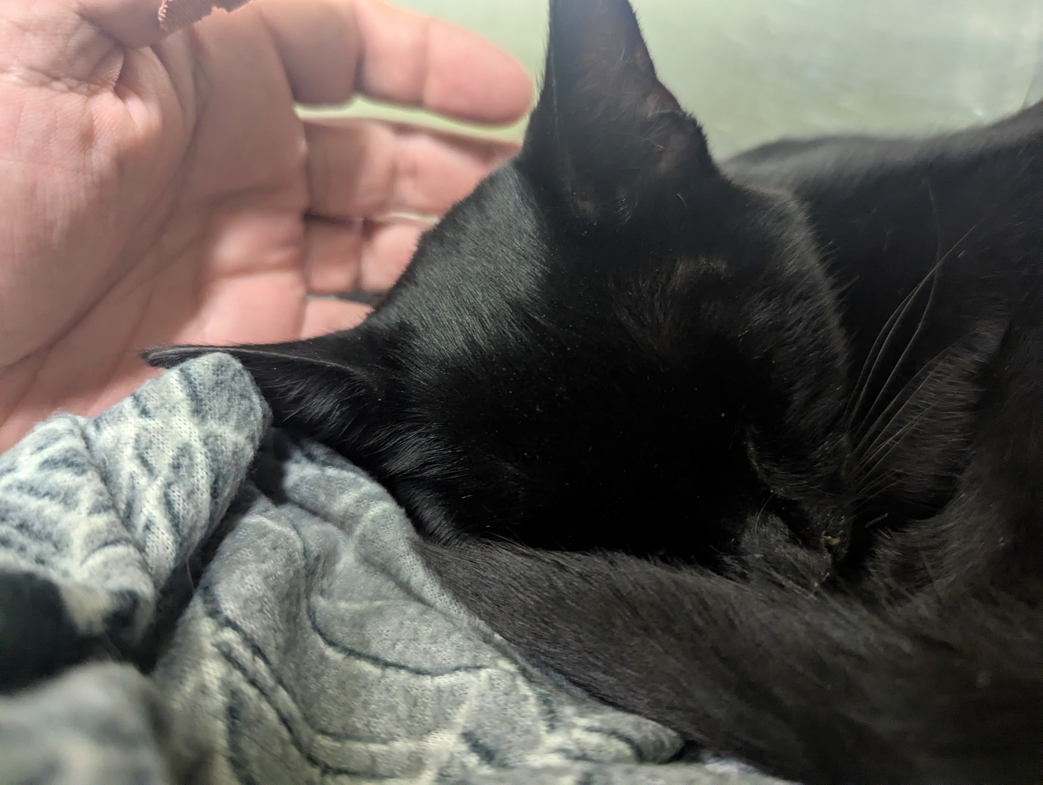 7/19/25 - Caboose is slowly adapting to the house cat lifestyle. He's already showing comfort with being picked up and meeting new people. As I enter the room, Caboose will try to meow a hello at me, but is still silent and unable to use his voice. While he seems to be able to purr again without issue, time will tell if he regains his ability to meow. I'm happy to have him with me; it's truly a joy to visit him throughout the day. His neck stitches come out on August 2nd, at which point I'll be looking to line up a suitable adopter. He's a fun video of him in the cuddle zone.