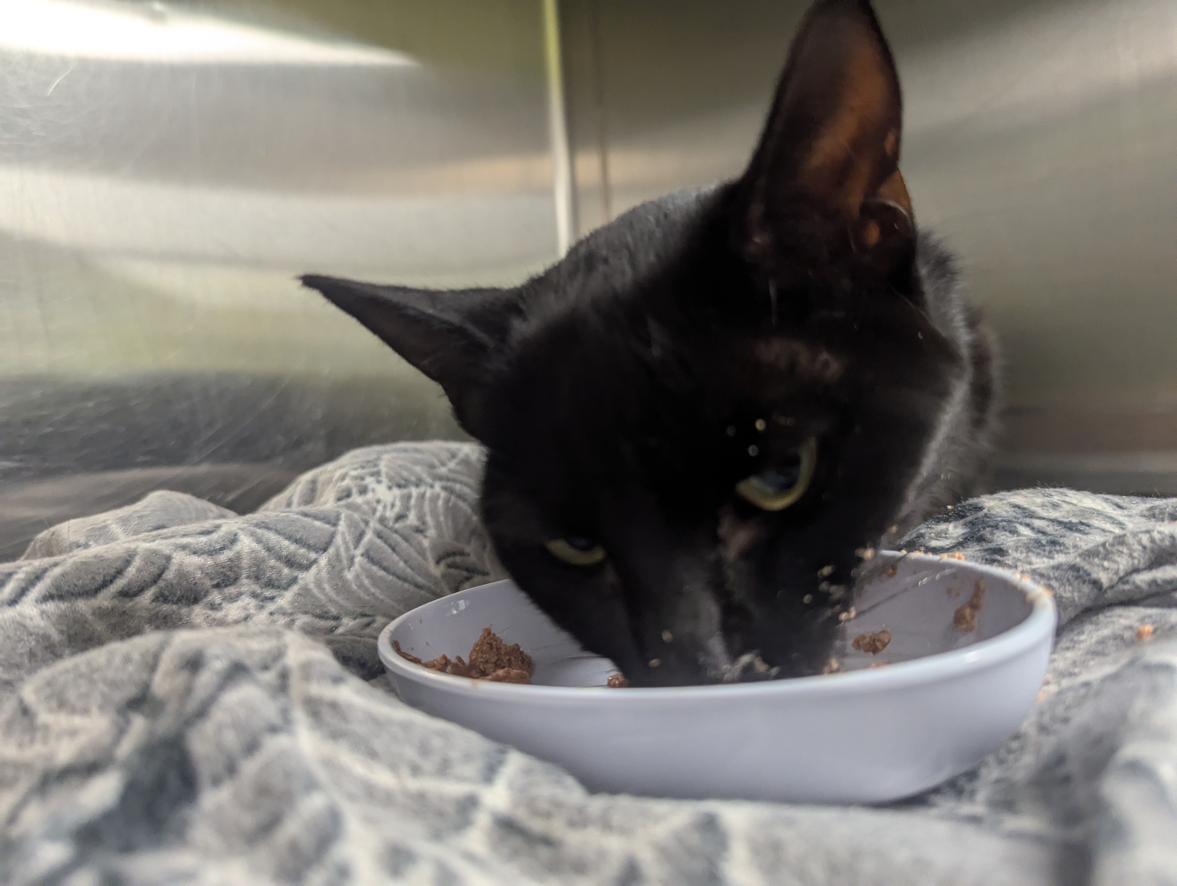 7/19 - Caboose is living the dream foster cat life with an endless supply of canned food and pets. He seems a bit scared when it comes to new noises and me entering the room, but quickly realizes there is nothing to fear. I'm able to call him away from the food he's been eating by saying his name. I swear this cat knows his name already! He's taken to using the litter box and has been accident-free. Let's just say he's a straight A student already! Stitches are looking good and we're on the path to recovery.