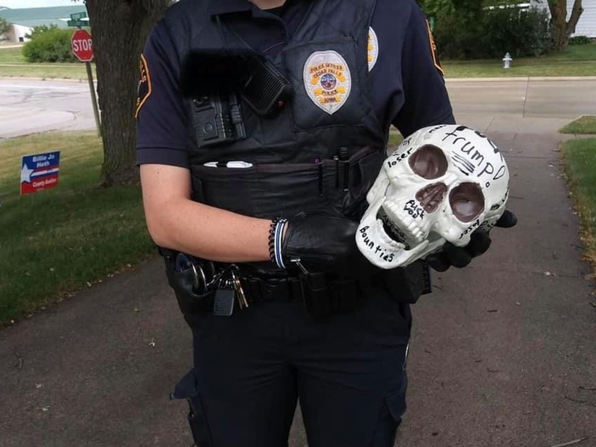 Police said messages in permanent marker were scribbled on the plastic skull, which was left on the Keve’s lawn amid campaign signs they placed there ahead of the upcoming election.