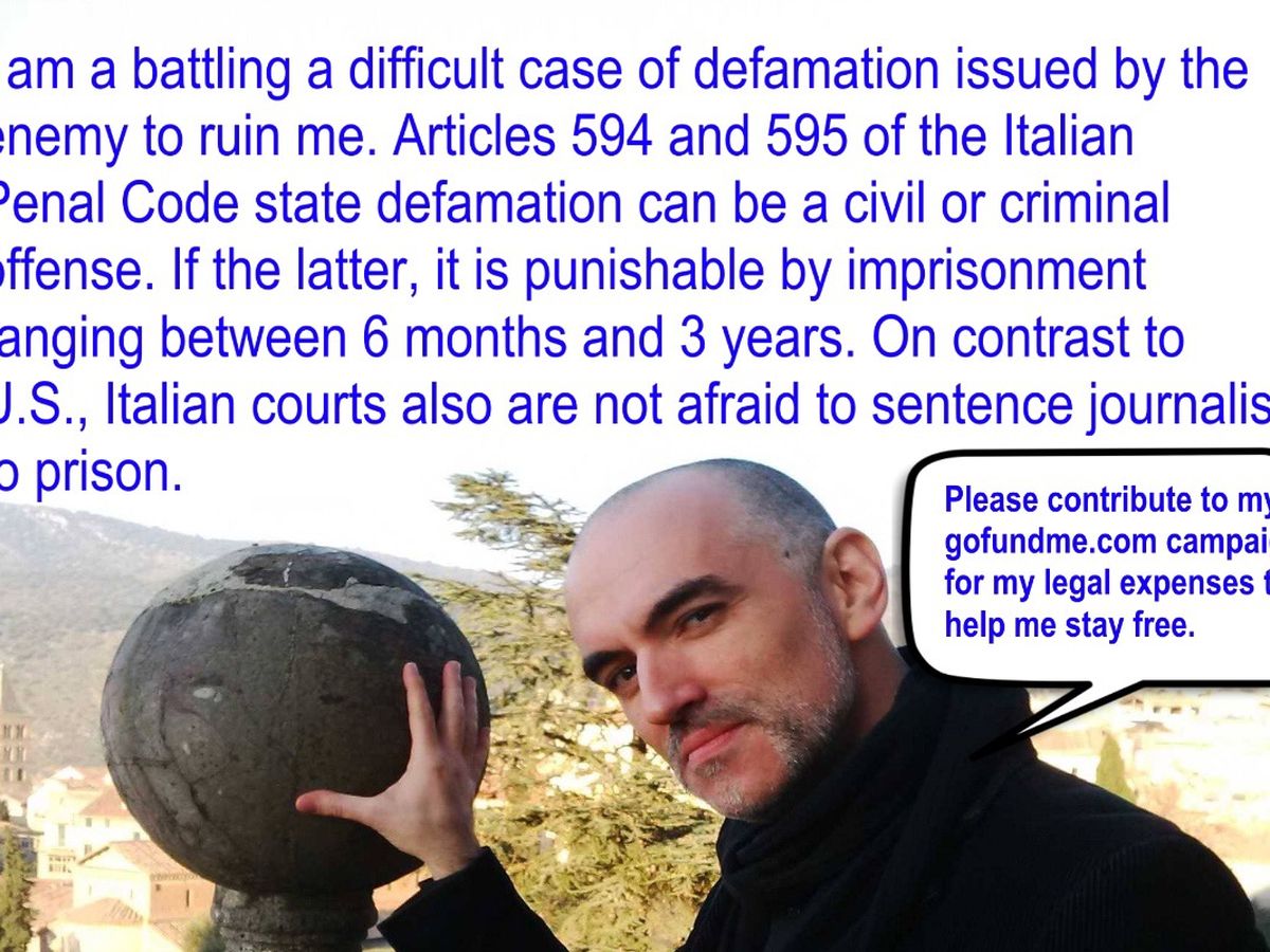 Carissimi amici di solito non parlo mai dei problemi e dei notevoli disagi personali creati dal mio lavoro di divulgatore e autore antisistema in Italia e sinceramente mi vergogno anche un pò a scrivere tutto questo. Ma purtroppo in questo Paese più di ogni altro i miei nemici vogliono vedermi rovinato, e negli ultimi anni le spese legali che sto affrontando per rimanere in Italia e difendermi da cause come quella descritta nell'articolo sottostante dal collega Umberto Maiorca sono salite alle stelle; e sinceramente non riesco più a sostenerle da solo. La magistratura rossa e la Massoneria deviata si sono accordate per rovinarmi definitivamente, e il popolo italiano deve saperlo per potermi aiutare in questa battaglia legale che potrebbe ridurmi sul lastrico se non ricevo il vostro aiuto nei mesi a venire.Purtroppo in Italia come già sapete i miei cosiddetti colleghi della controinformazione al soldo del nemico mi hanno voltato le spalle da tempo, e non mi fanno più apparire in radio o in TV, non mi invitano più a fare conferenze, e infine i miei libri italiani sono stati gradualmente ritirati dalla distribuzione e sabotati negli ultimi 5 anni dalla sinistra mondialista che come sapete ha ancora in mano il mercato dei libri in questo Paese. Quindi non ho sinceramente altri mezzi economici di sostentamento in Italia se non chiedervi di aiutarmi con www.gofundme.com
