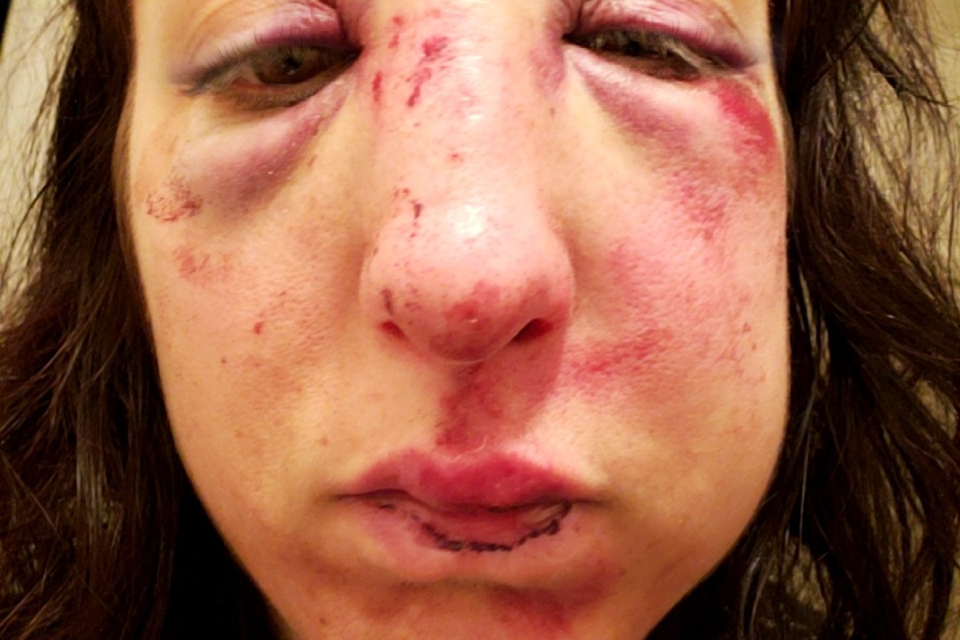 My partner, Candace, was on her way home from work yesterday evening (December 9th) when someone on an electric scooter ran a stop sign and hit her. She is a bicycle courier and was hit while on her bike. Luckily she had a helmet on but as you can see from the photo's she was pretty badly injured. She suffered a concussion, has fractured cheekbones and a broken tooth. Her hands and should were also beat up and bruised as well as a slight pain in her knee.
