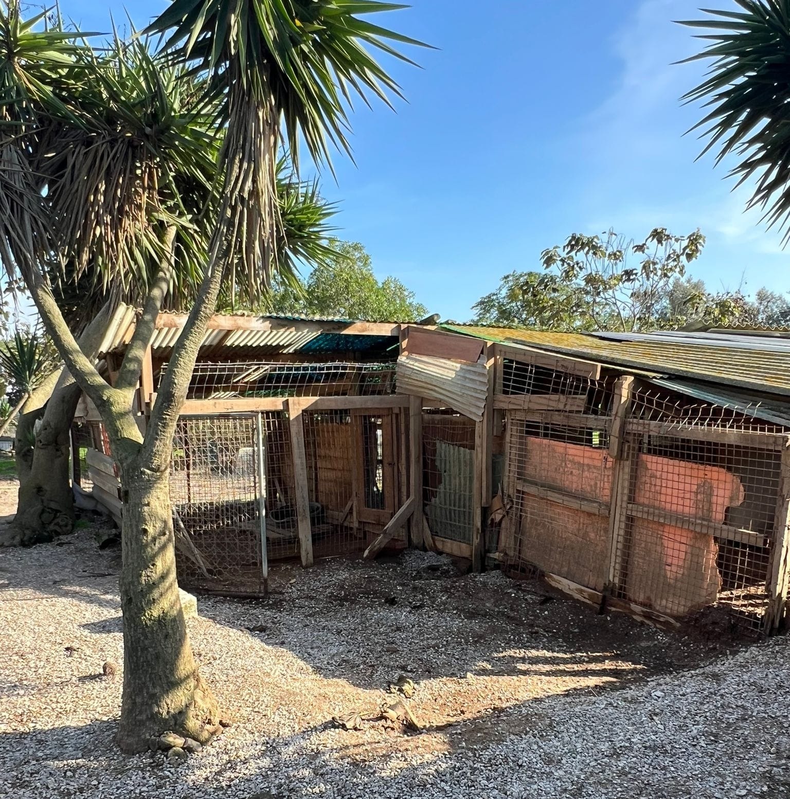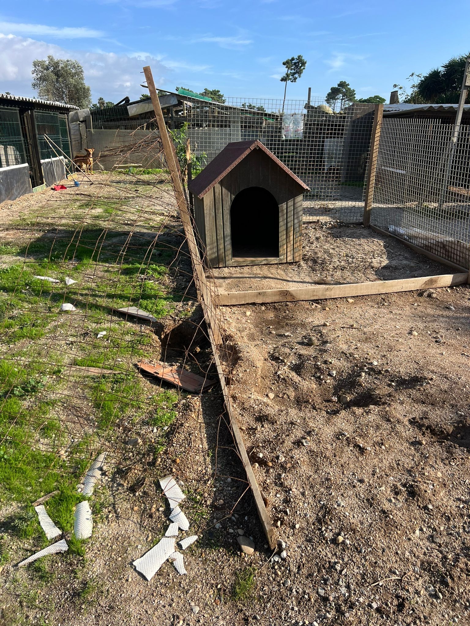 Boxes em ruínas – as estruturas estão a apodrecer e já não oferecem segurança nem conforto, deixando os nossos patudos em perigo. Muitas boxes foram danificadas pela Tempestade Martinho (março de 2025), e ainda não conseguimos recuperar grande parte do prejuízo.