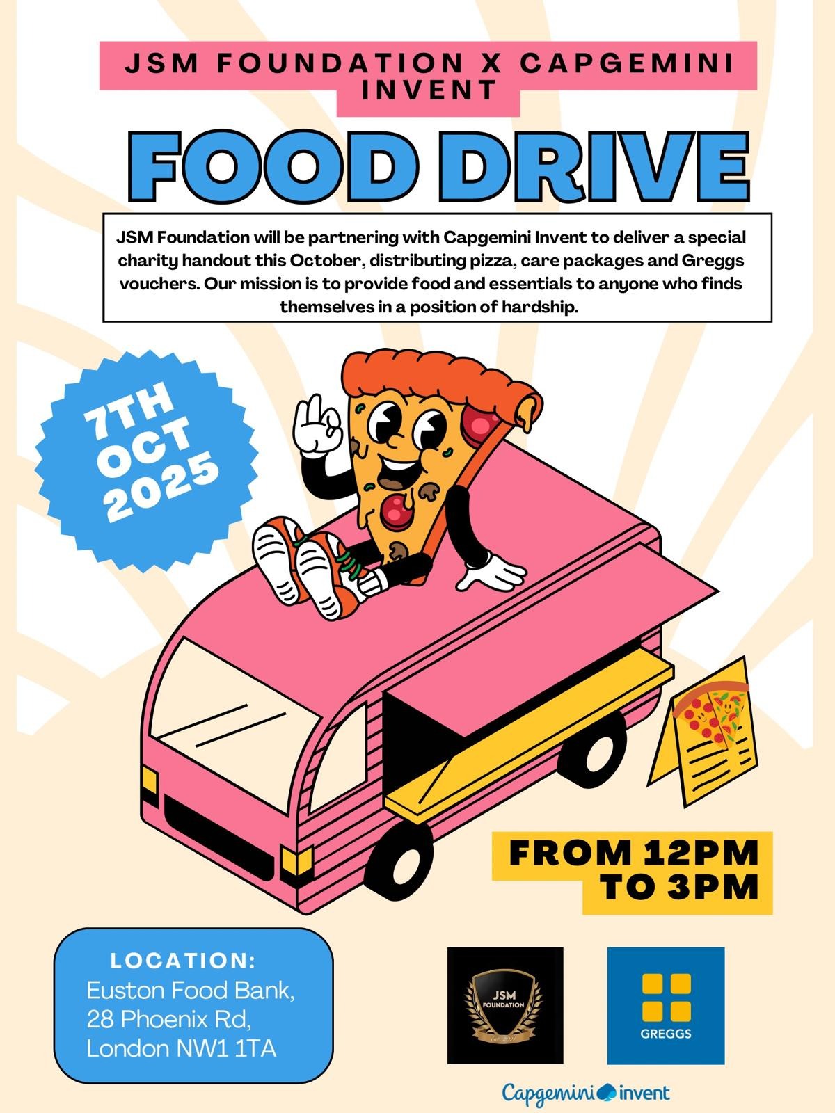 Our team of Capgemini Invent Financial Services and JSM Foundation volunteers will be giving out pizza, care packages and Greggs vouchers to those in need on Tuesday October 7th 2025 at Euston Foodbank, London.