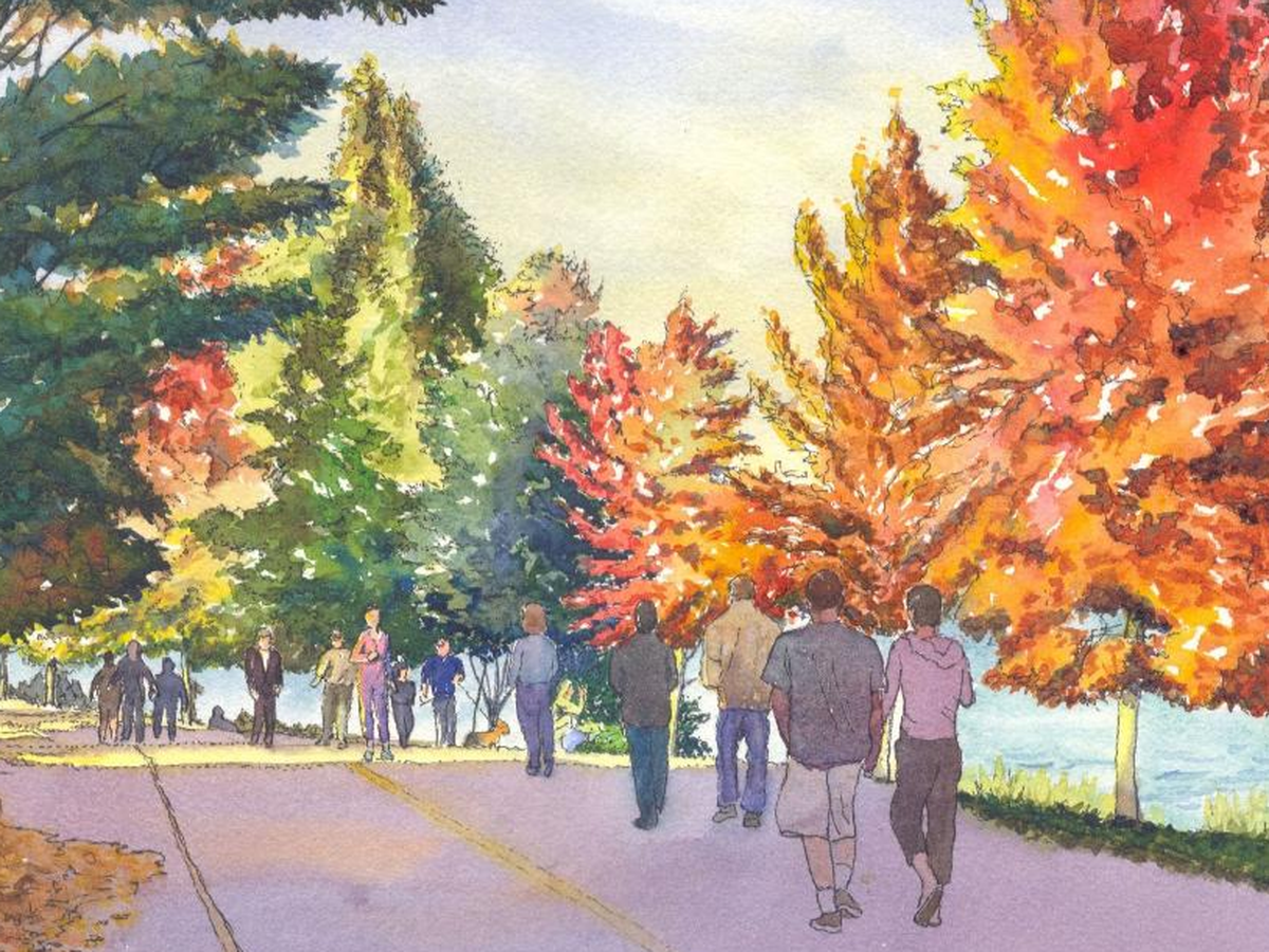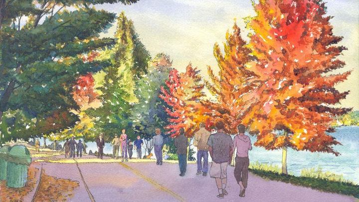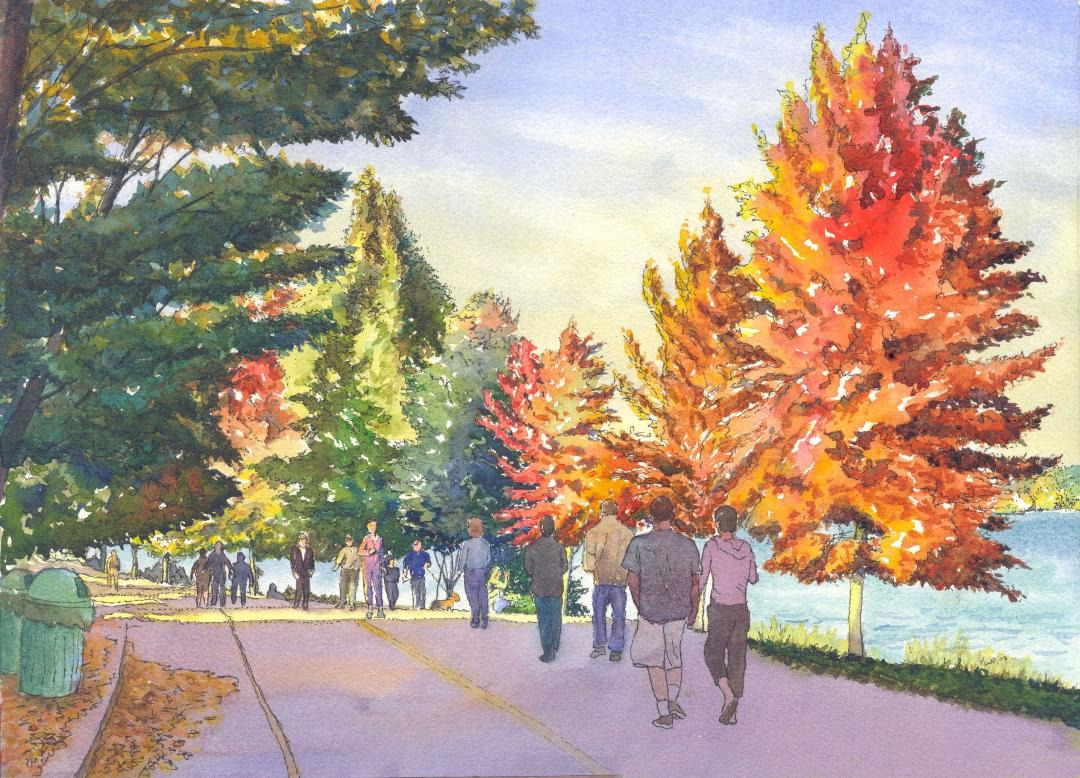 The watercolor illustration is Greenlake (by Dave Baab), close to Doug and Margui's house, where they have walked so often.
