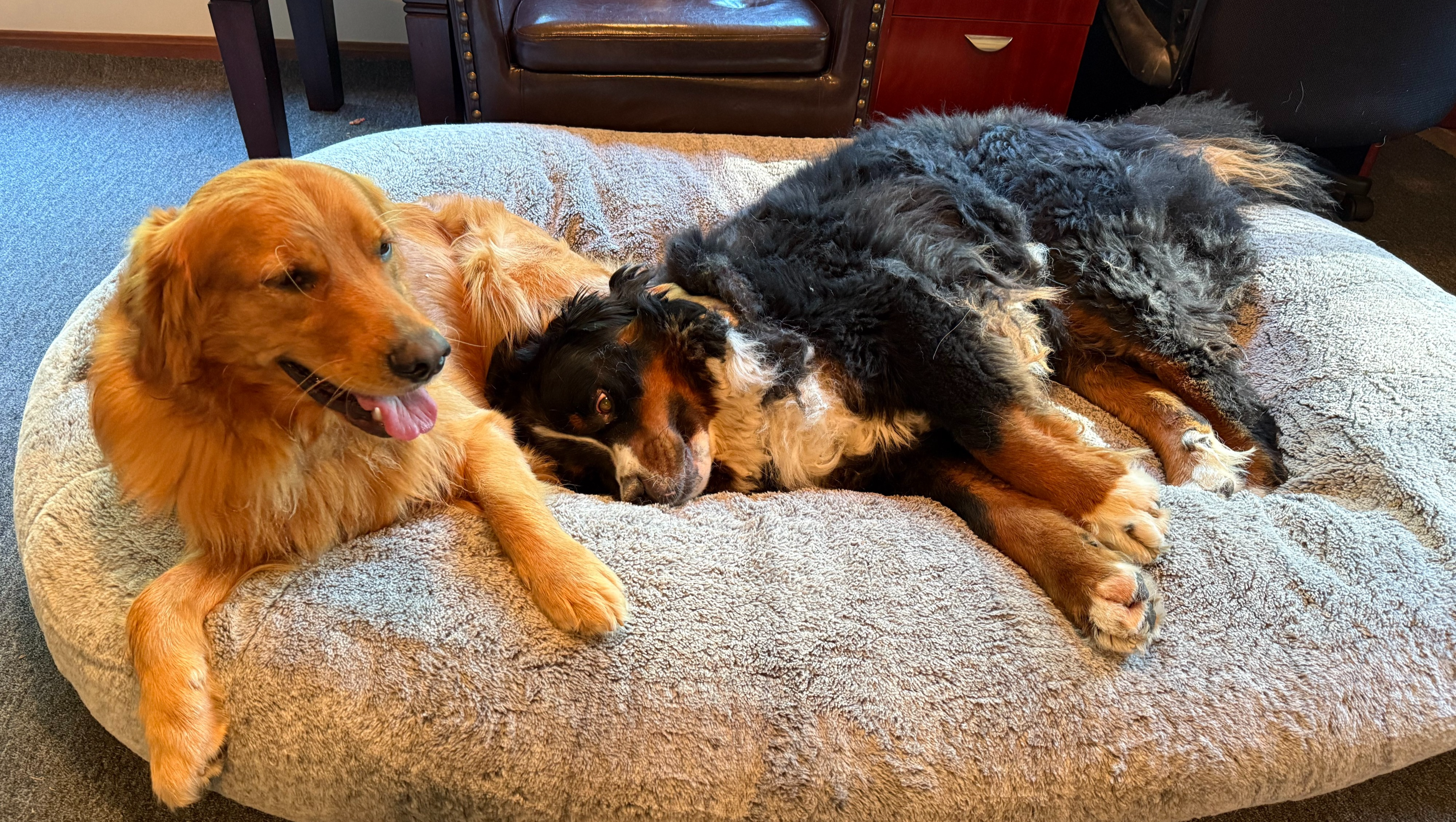 With the support and permission of the grandparents, Cooper and Pasta are now being lovingly cared for in a safe and stable home. Bill Hall of Durham has stepped forward as their primary caretaker and the organizer of this fundraiser, with custodial help from Bevie Ketel, a neighbor and family friend. Because one of the dogs has been diagnosed with agoraphobia, it has been especially important to keep the brothers together. No family member has been able to take them both permanently, but in this home, they are thriving — supported not only by each other, but also by Bevie’s certified medic dog, who has become a steady source of comfort.