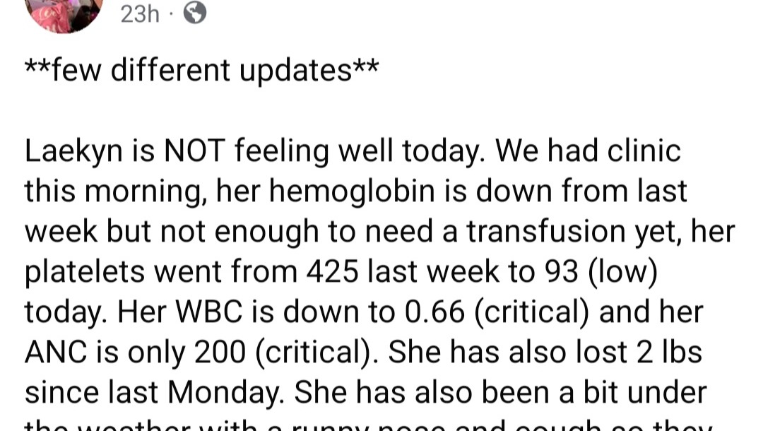 Laekyn returned to ER a few days ago & has been readmitted to Womens & Childrens Hospital. After undergoing a bone marrow biopsy, she has officially been diagnosed with B Cell Acute Lymphoblastic Leukemia. Her mother Jordan has all details on her Facebook Page. Treatment is approximately 2.5yrs. So, Laekyns Fight begins.......