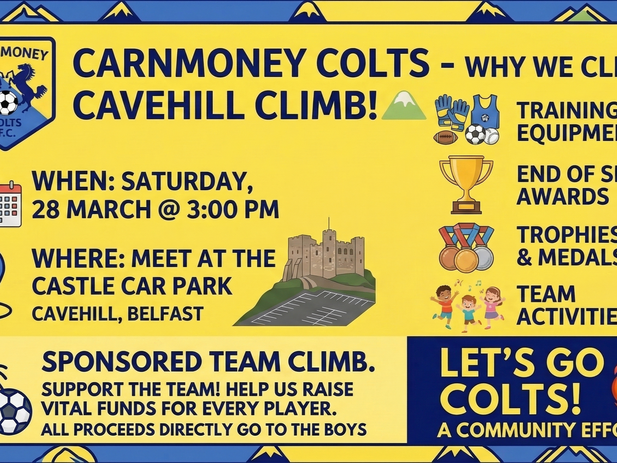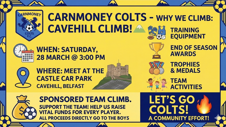 On Saturday, 28th March at 3:00 PM, the players, coaches, and families of Carnmoney Colts will be taking on the Cavehill Walk (meeting at the castle car park) to raise vital funds for our teams.