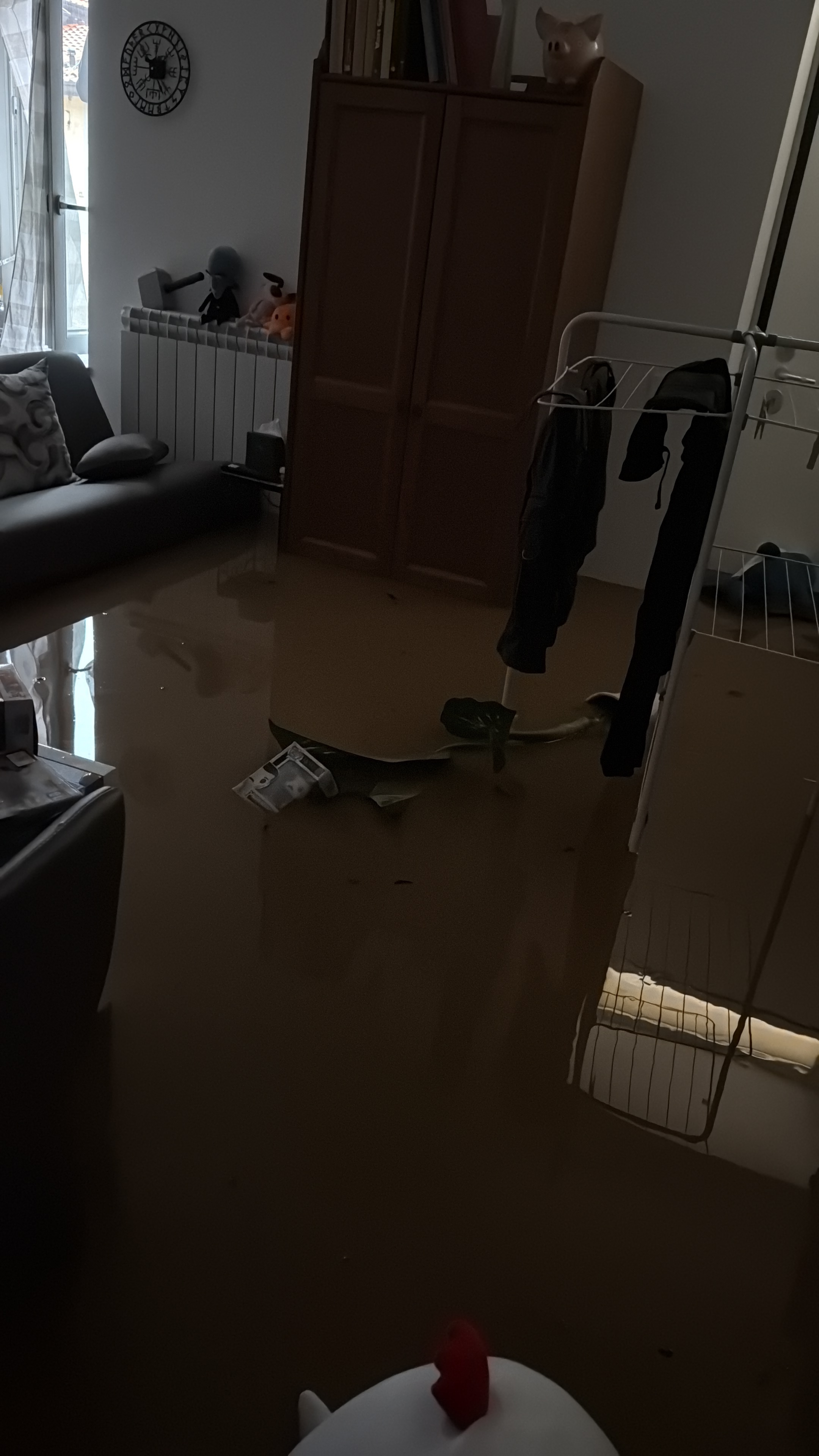 L’acqua ha raggiunto il livello sopra le ginocchia, l’unica via di accesso e uscita era la finestra del living. Il divano fluttuava per casa, così come tutti gli oggetti al di sotto di quel confine immaginario.