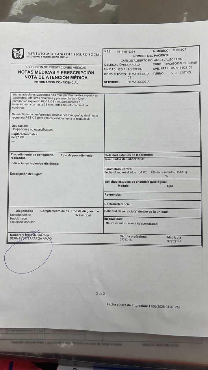 "Desde el 2023 cambiaron muchas cosas en mi vida; físicas, mentales, profesionales; por que fui diagnosticado con linfoma Hodgkins." Y tuve mucha curiosidad en saber de que trataba esa enfermedad, aprendi a entender por los cambios de humor, energía y frustraciones. Desde entonces ha tenido tratamientos progresivos de quimioterapia, radiación, medicamentos, etc; sus constantes consultas, veia su constante esfuerzo de mejor, porque siempre iba constante y puntual a sus tratamiento y consultas, múltiples análisis sanguíneos, me preguntaba si era tan considerado e iba a donar o solo eran análisis.