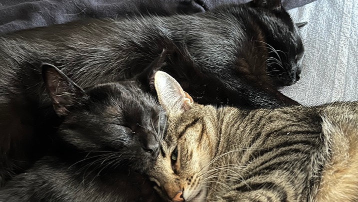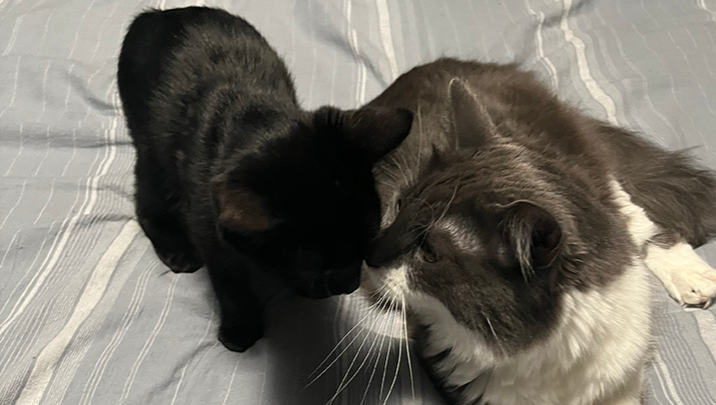 We adopted Casper, along with his brother Liebchen, back in September of 2023 from The Friends of Oakland Animal Shelter. They came into a welcoming home and became the perfect siblings to our 1 year olds Tiffany and Captain Howdy, whom we adopted the previous year from the same shelter. Casper is the smallest of the group. He's also the most rambunctious! He likes to taunt his siblings, climb behind the tv, and is mesmerized by our printer when it's printing. When all the others are sleeping, you can find him knocking water cups over and attempting to climb into the bathtub after a fresh shower. He's fearless and even the loud whirring of the vacuum doesn't scare him.