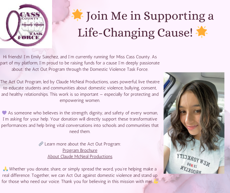 Donations are open NOW, so let’s make an impact together. Thank you for supporting both my Miss Cass County journey and the incredible work of the Act Out Program!