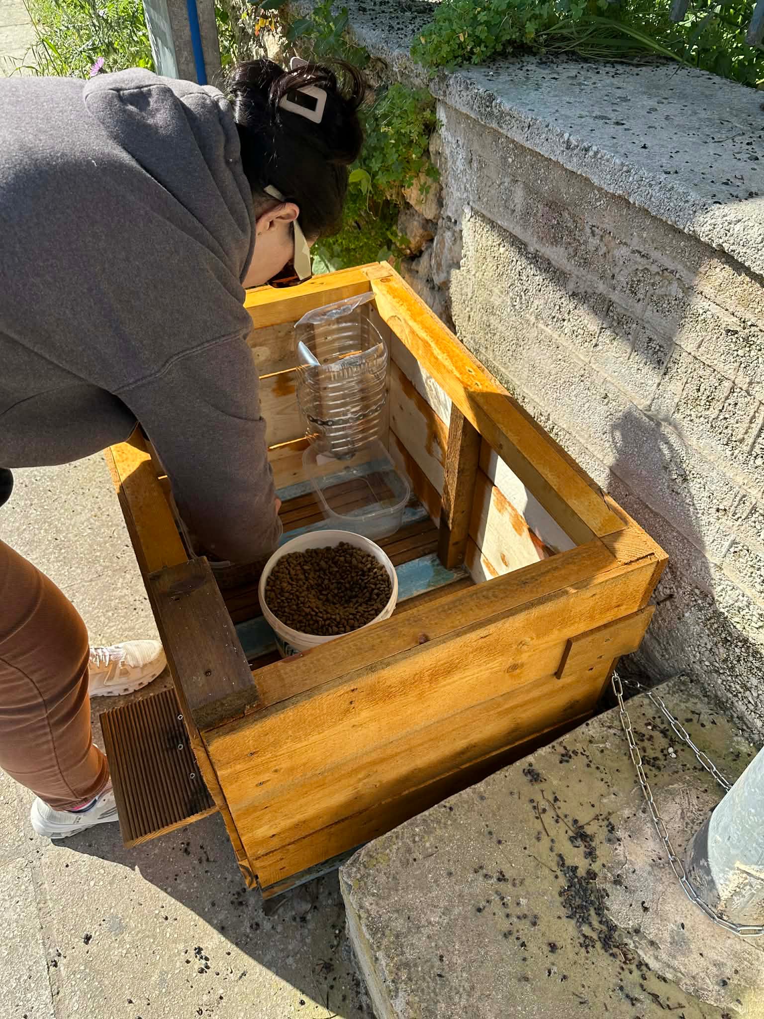 One thing we are keen to do is to ensure that the many cats have access to clean food and water at different times of day even when we aren’t there- at the moment it relies on us using large trays which often get exposed to the elements.