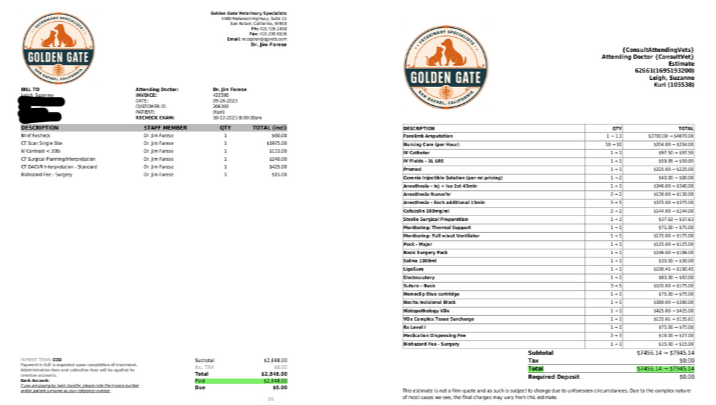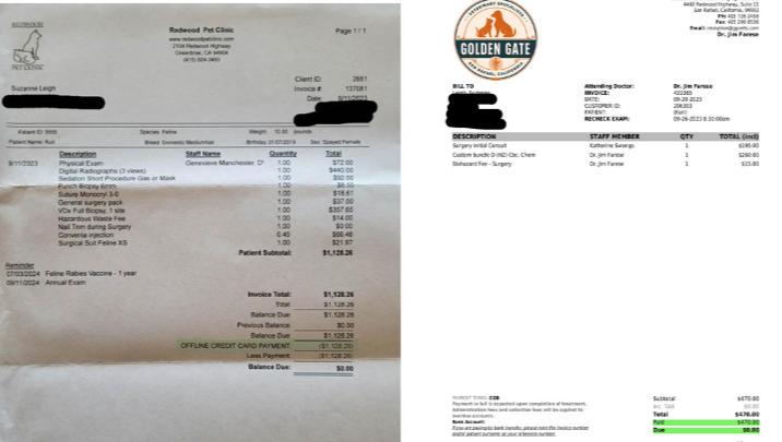 The invoices for the diagnosis totaled roughly $5,000 and have been submitted to my pet insurance, which has limits of 5k. :-(