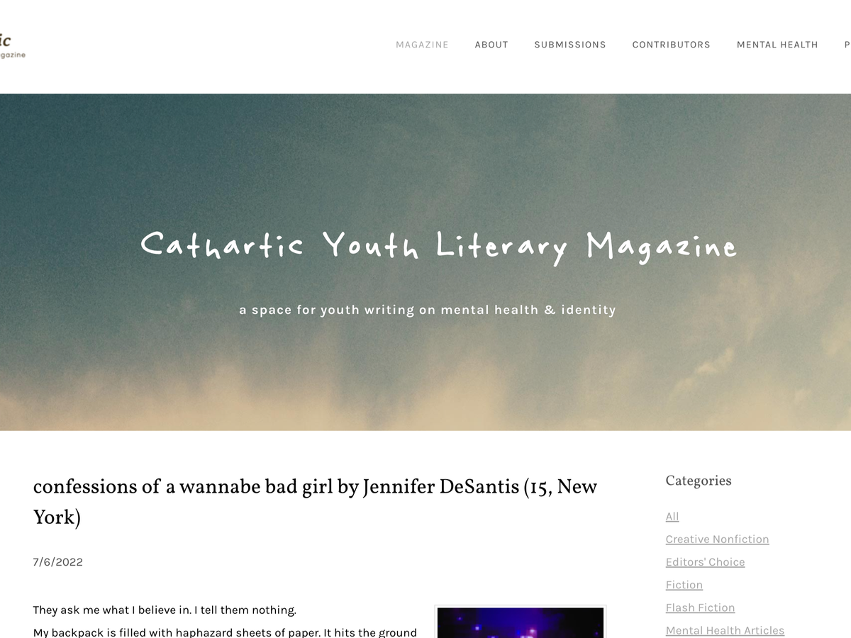 Cathartic Youth Literary Magazine is an online platform dedicated to using writing as catharsis, breaking the barrier around mental health, and providing an open platform for middle school to college-age writers to express themselves. Founded in 2020, our project started off with three goals: 1) to foster and destigmatize conversations about mental health and identity, 2) to encourage finding mindfulness through writing, and 3) to create an open platform for young people to publish writing without the barriers of submission fees and long response times, as a young writers' stepping stone to larger publications.