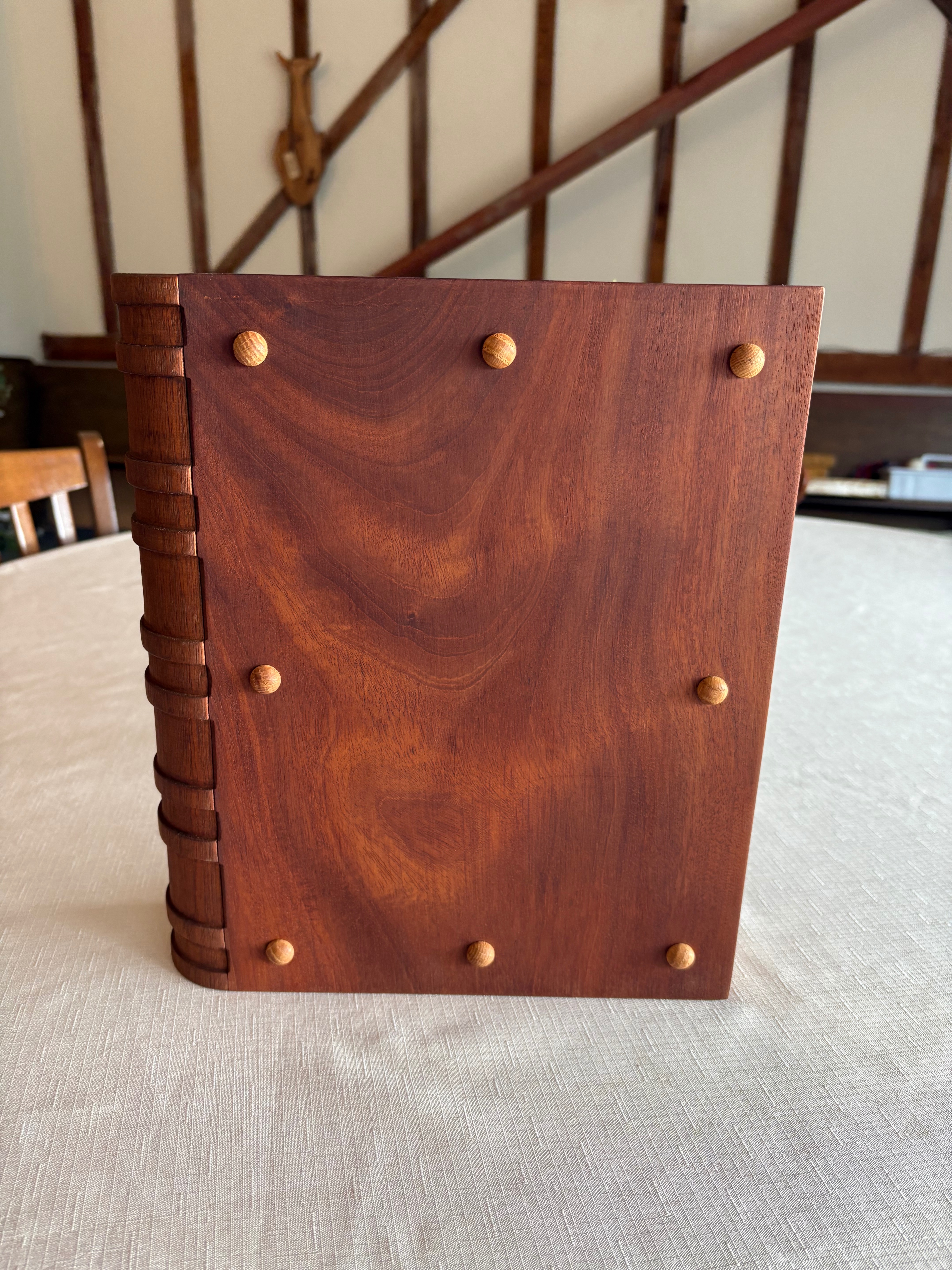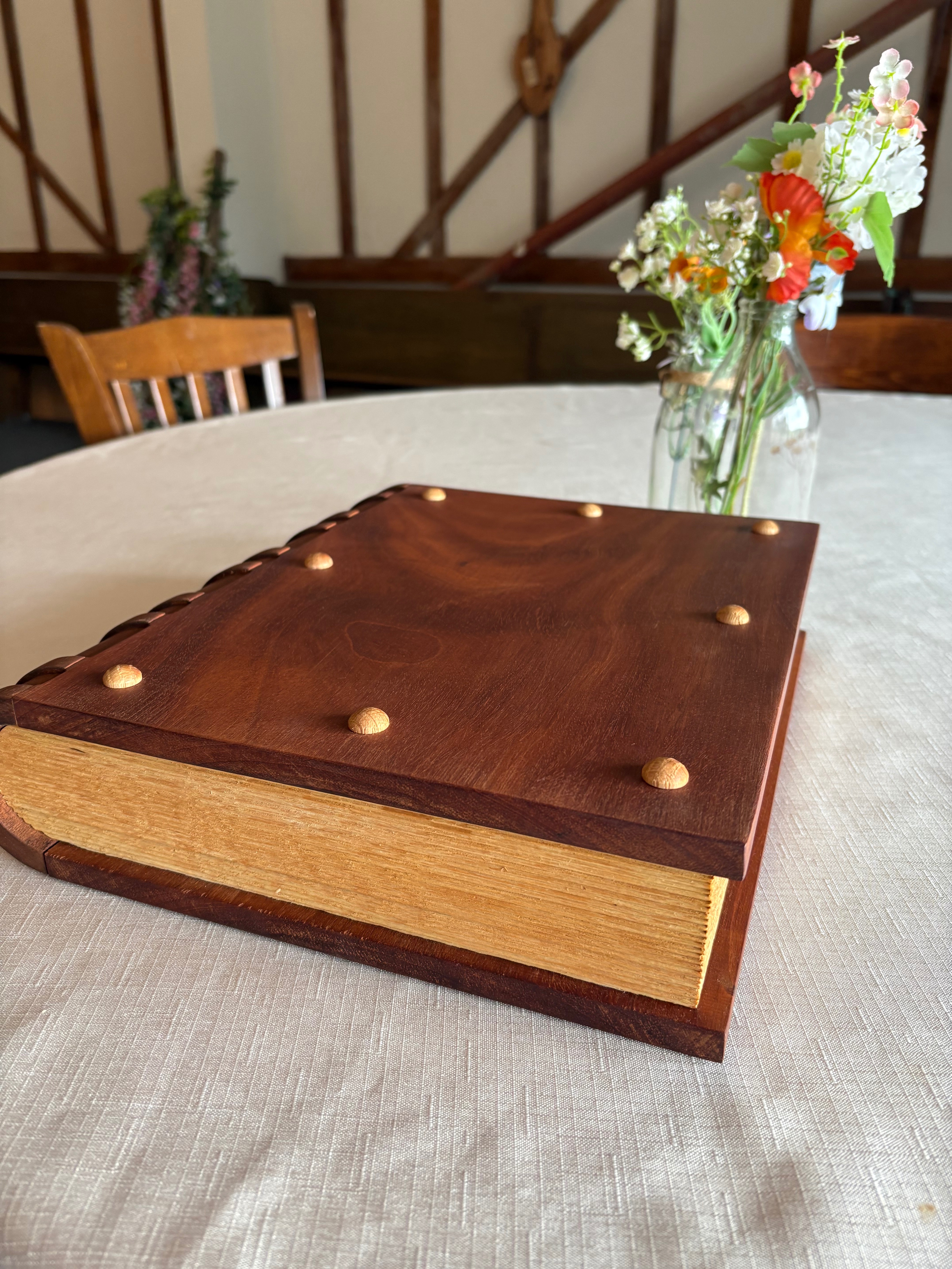 Instead we are kindly inviting you to donate towards a memorial piece for Cathie’s ashes. This is a bespoke made wooden book rather than a china urn, which will keep Cathie safe at home with us. As a librarian Cathie always had a love for books so this piece feels very fitting (please see photo attached).