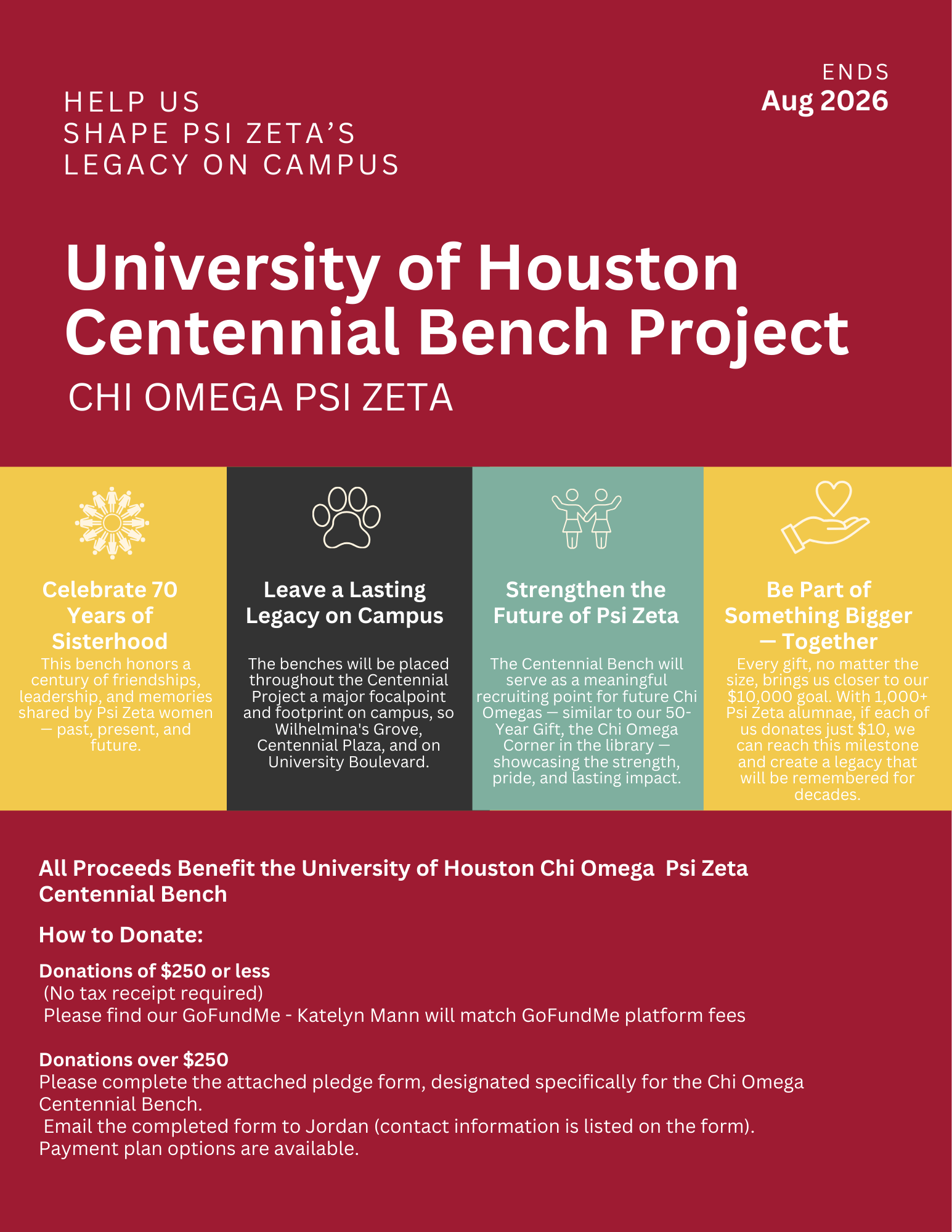We are aiming to raise $10,000 by August to make this bench a reality. With more than 1,000 Psi Zeta alumnae, if everyone contributes even $10, we will reach our goal together!