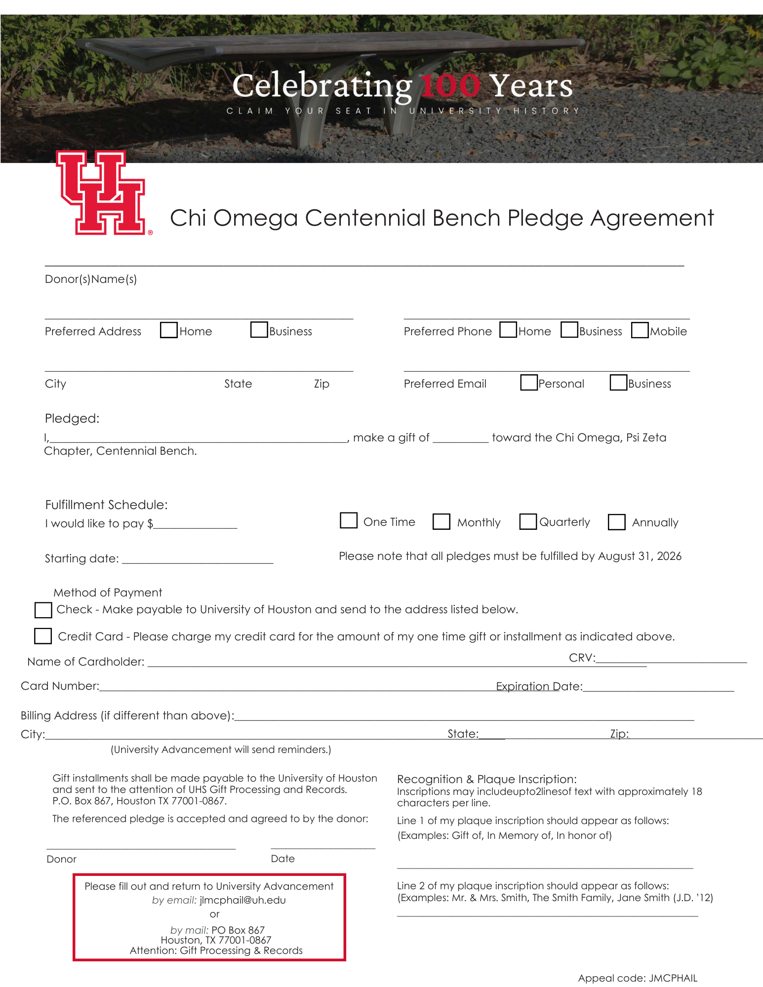 To make giving easy, this GoFundMe will be used for gifts under $250. In the spirit of maximizing every contribution, I will personally match the GoFundMe platform fees (and more) so that your donation has the greatest possible impact toward the bench. If you would like to contribute $250 or more, please make your pledge directly to the University of Houston so you can receive a tax receipt and be recognized for your generous gift. I have included the form for a $250+ donation