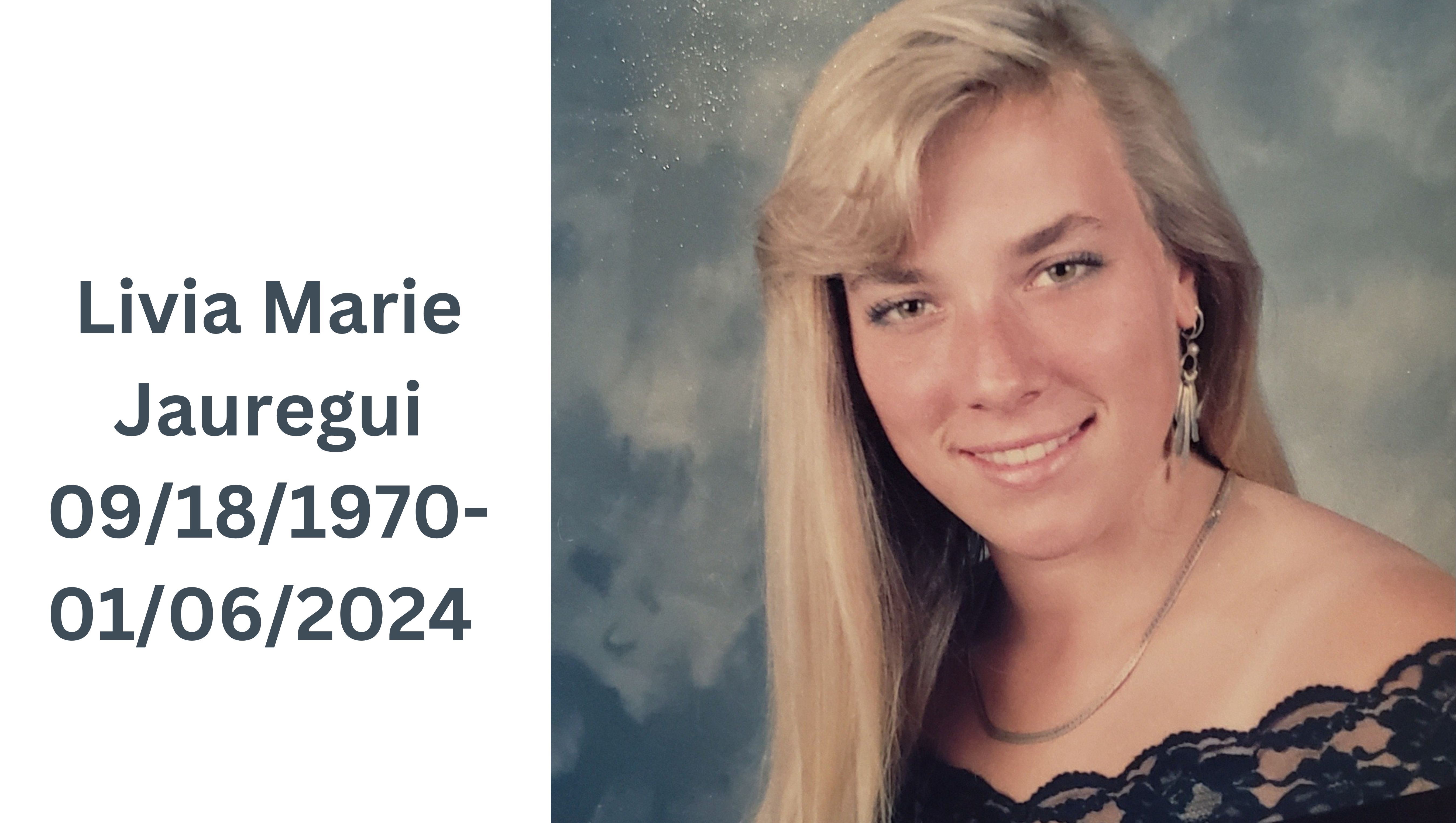 It is with heavy hearts that we share the news of the passing of beloved Livia Jauregui, a special soul who had a wonderful laugh and sense of humor, as well as big heart. Due to a series of medical complications, Livia left us too soon, and unexpectedly passed away the evening of Saturday, January 7th, 2024. She is survived by her two incredible children, Allison and John Neef.