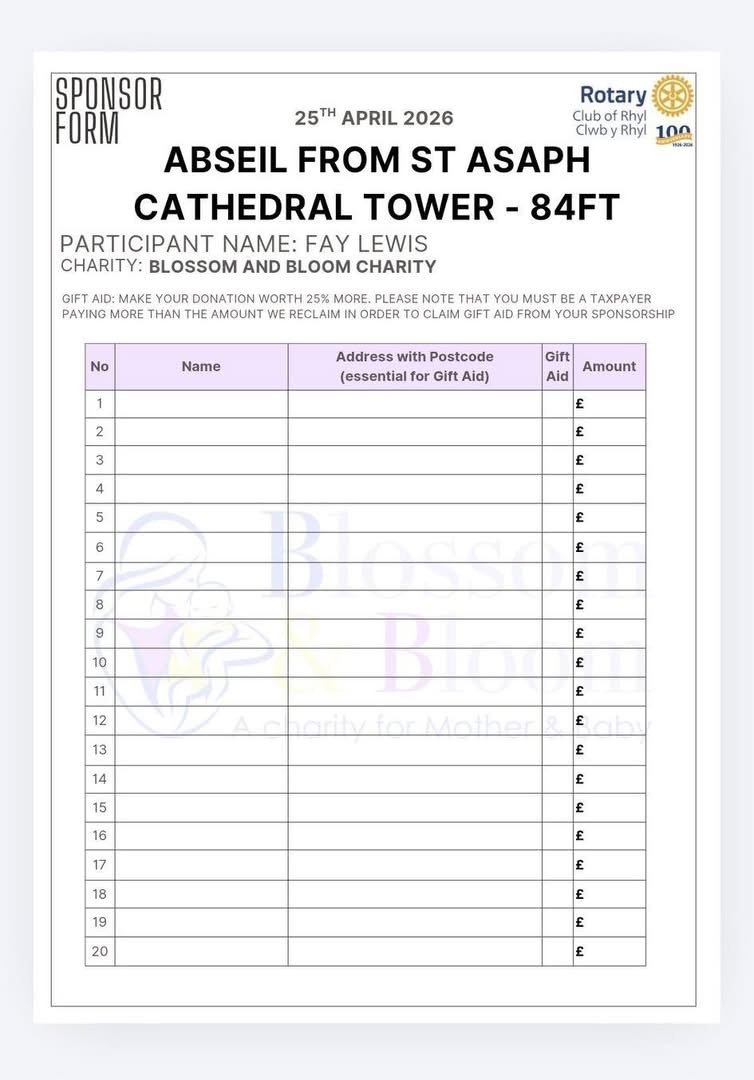 Six amazing supporters have signed up to take part in the Rotary Club of Rhyl 100th Anniversary Charity Abseil, taking place on Saturday 25th April at St Asaph Cathedral and they’ve chosen our Blossom & Bloom as their chosen charity