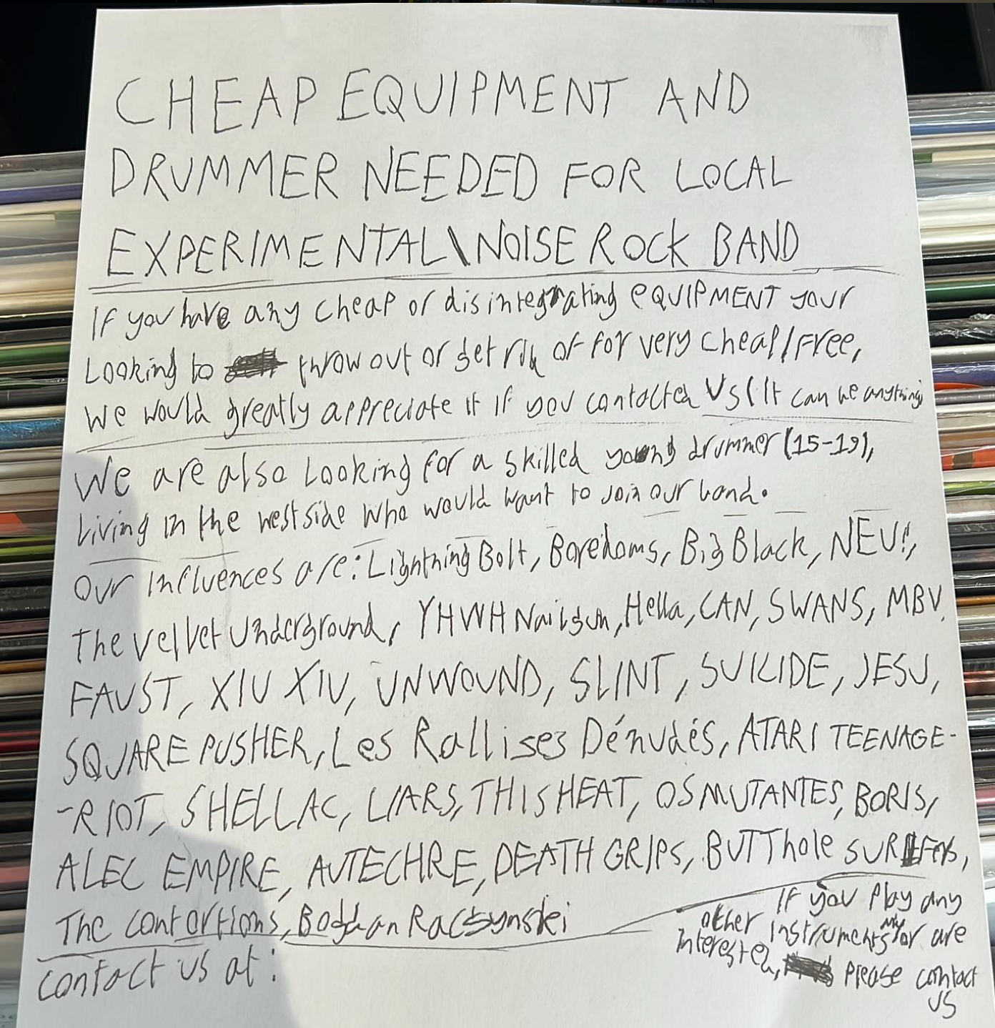 We (Footscray Records) posted the charming 'drummer needed' poster of one of our regular 14 year old noise fanatics. We posted this on reddit and our instagram and lots of people far and wide were interested in helping him out. His influences have really struck something in the hearts of the older noise rock community.