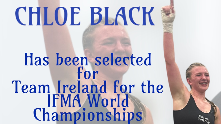 Carlow Muaythai are privileged and delighted to say Chloe Black has been selected to represent Ireland at the 2025 IFMA World Championships to be held in Turkey this May from the 22nd to the 31st.