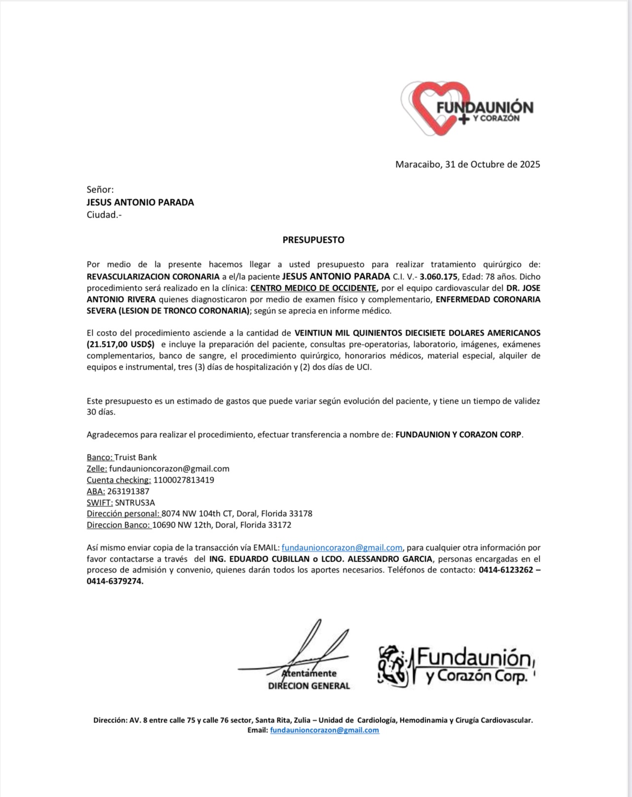 El día viernes 31 de octubre fue la cita con el Cirujano Cardiovascular, dónde después de ver los estudios y la película del cateterismo confirma que se debe realizar está cirugía lo más pronto posible porque literalmente el corazón de mi papá es una bomba de tiempo , y los presupuestos para salvarle la vida a mi papá son muy costosos.
