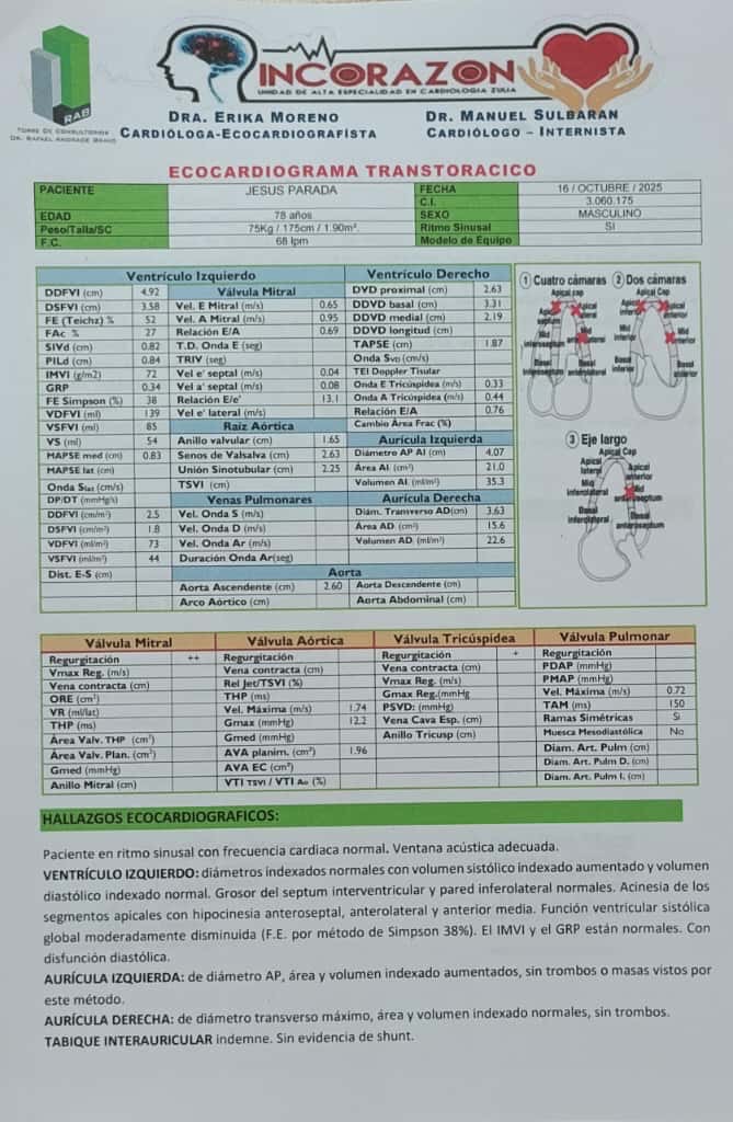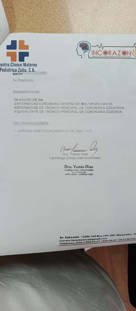 Mi papá vive en el municipio Lagunillas, una persona muy activa a sus 78 años (cumplidos el 26 de octubre) literalmente activo, que puede estar cargando un botellón de agua y subir unas escaleras.. el día 09 de octubre después de cortar la grama en su casa con una desmalezadora en horas de la noche comenzó a sentirse mal con dolor en el estómago, cuello y en la espalda, cuando lo llevan al centro asistencial lo trataron como si fuera un daño estomacal aún teniendo una tensión de 230, le colocaron un calmante y lo enviaron a su casa, al otro día unos amigos lo llevan a hacerle unos exámenes particular y un electrocardiograma donde arroja como resultado que había sufrido un infarto (dejándole dicho que mi mamá no me quería decir nada), un amigo fue quien me avisó lo sucedido un día antes con mi papá, yo agarro mi carro y me traslado a lagunillas, dónde ellos viven y me traje a mi papá a mcbo dónde entramos directamente al General del sur (la atención por parte de todo su personal fue excepcional), allí es ingresado y hospitalizado en la unidad de cardiología, después de varios estudios los médicos nos informan que deben hacerle a mi papá un cataterismo de emergencia.