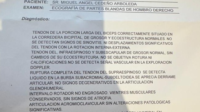 Yo, Miguel Angel Cedeño Arboleda, soy el único beneficiario de esta recaudación y el dinero será destinado exclusivamente a salvar la movilidad de mi brazo y tratar la rotura de los tendones de mi hombro.