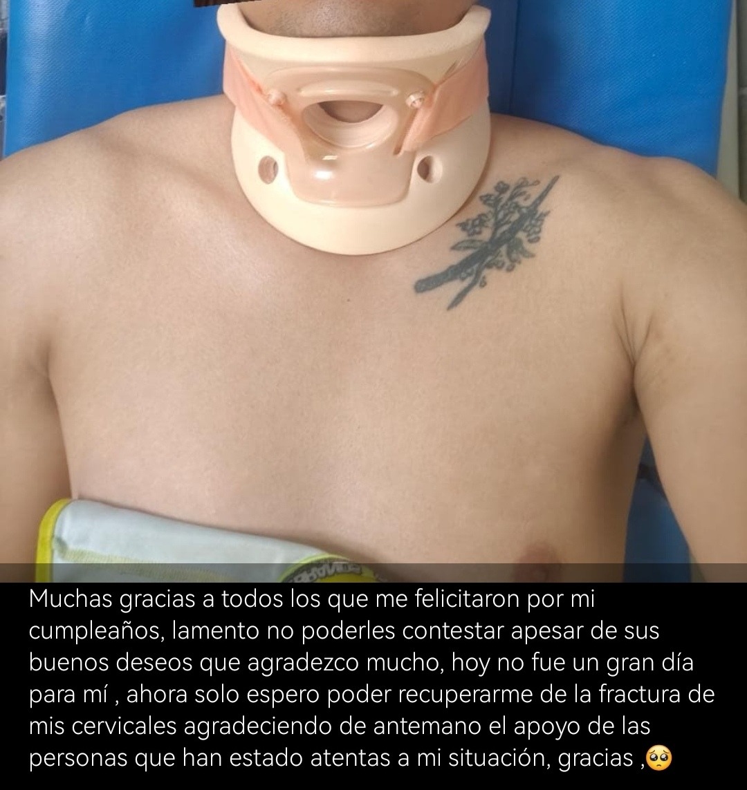 Estuve hospitalizado dos días por posible fractura de cervicales, me realizaron una tomografía y radiografías pero me diagnosticaron un simple esguince de segundo grado, me levantaron para retirarme y me dijeron que en dos semanas de reposo me recuperaría totalmente.
